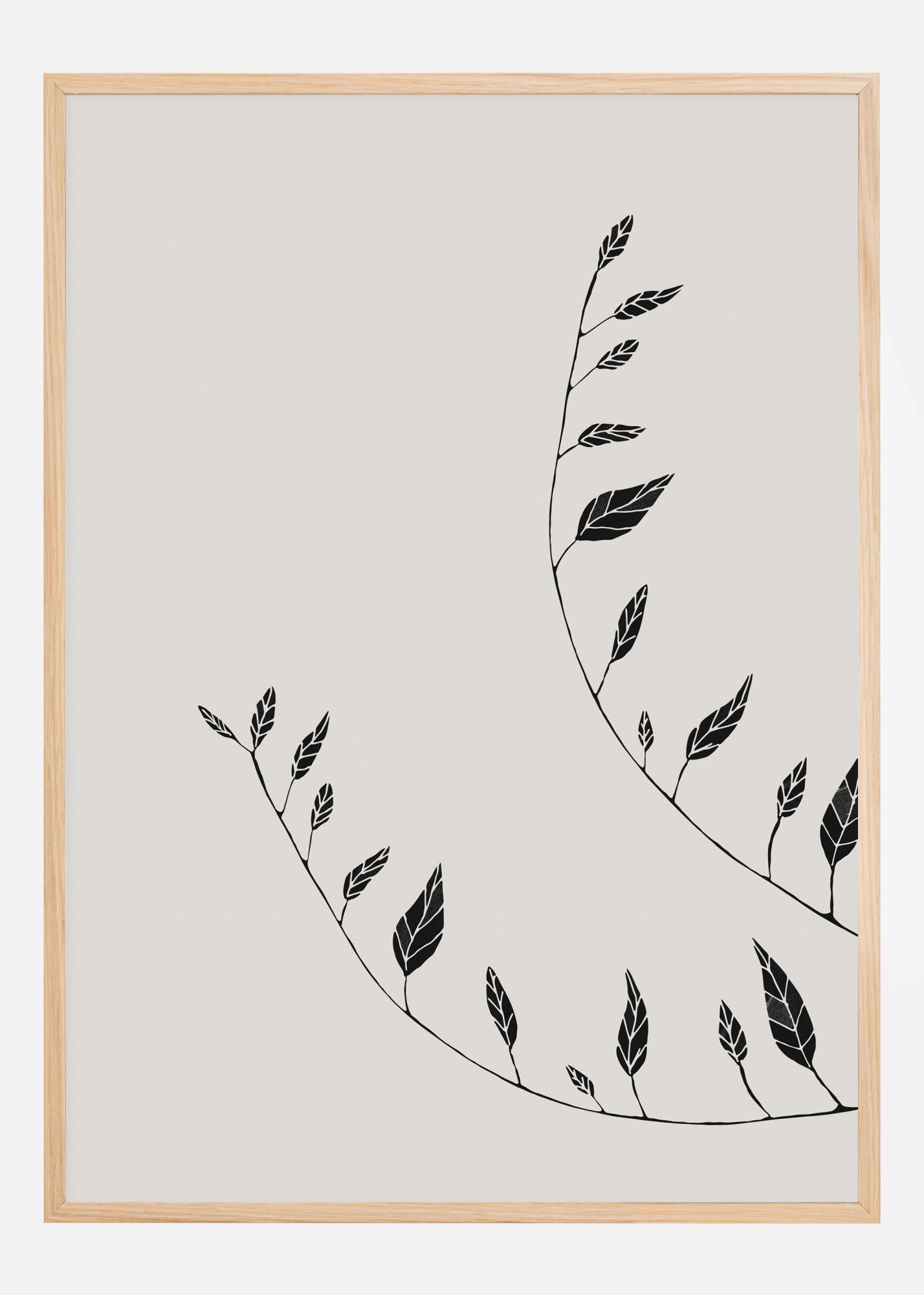 Černobílý plakát s jednoduchými větvemi a listy na bílém pozadí. Dvě větve přicházejí zprava a ohýbají se vzhůru směrem k horní části plakátu. Listy jsou všechny otočené nahoru na jedné straně každé větve. Ohyby vytvářejí pocit, že rostlina roste, když se natahuje směrem k neviditelnému slunci.