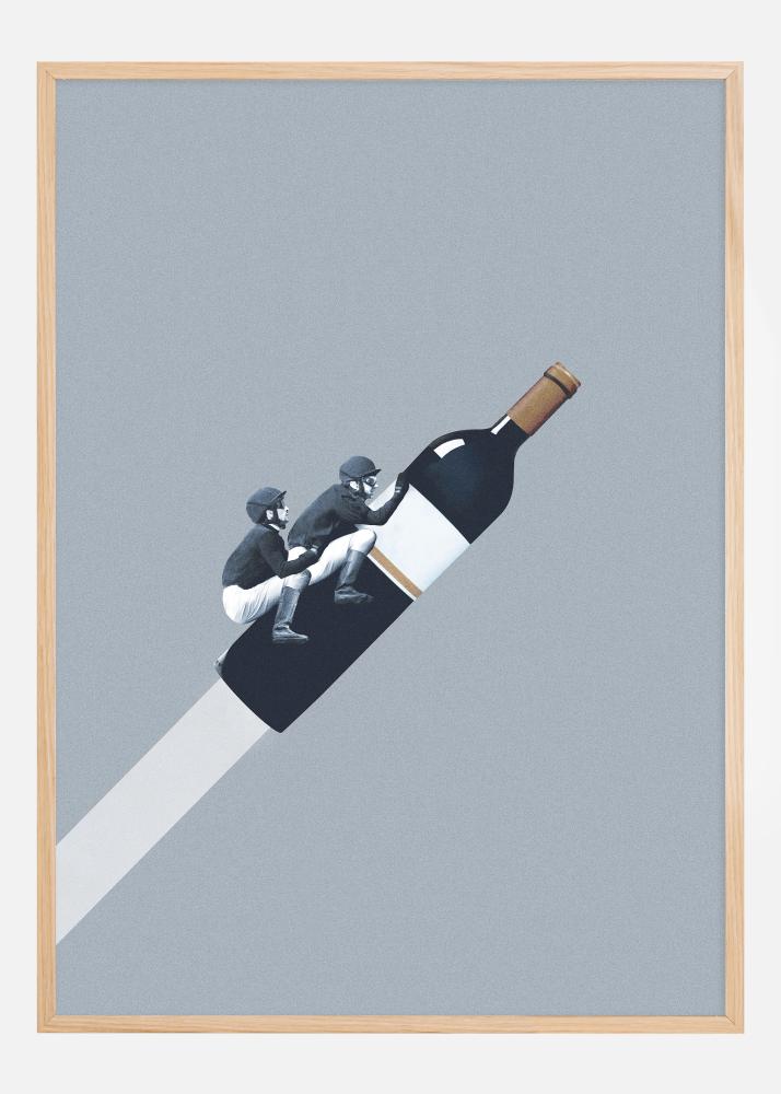 Tento jedinečný a podnětný plakát zachycuje fantastickou scénu, kde dva lidé v klasickém jezdeckém oblečení triumfálně jezdí na šikmé lahvi vína. Scéna je dílem kreativní fantazie, která propojuje tradiční s absurdním a vytváří pocit dobrodružství a únik. Ukazuje, jak dva jezdci mohou zvládnout všední životní "vínové vlny" stejnou grácií, jakou by se proháněli zvlněnou krajinou.