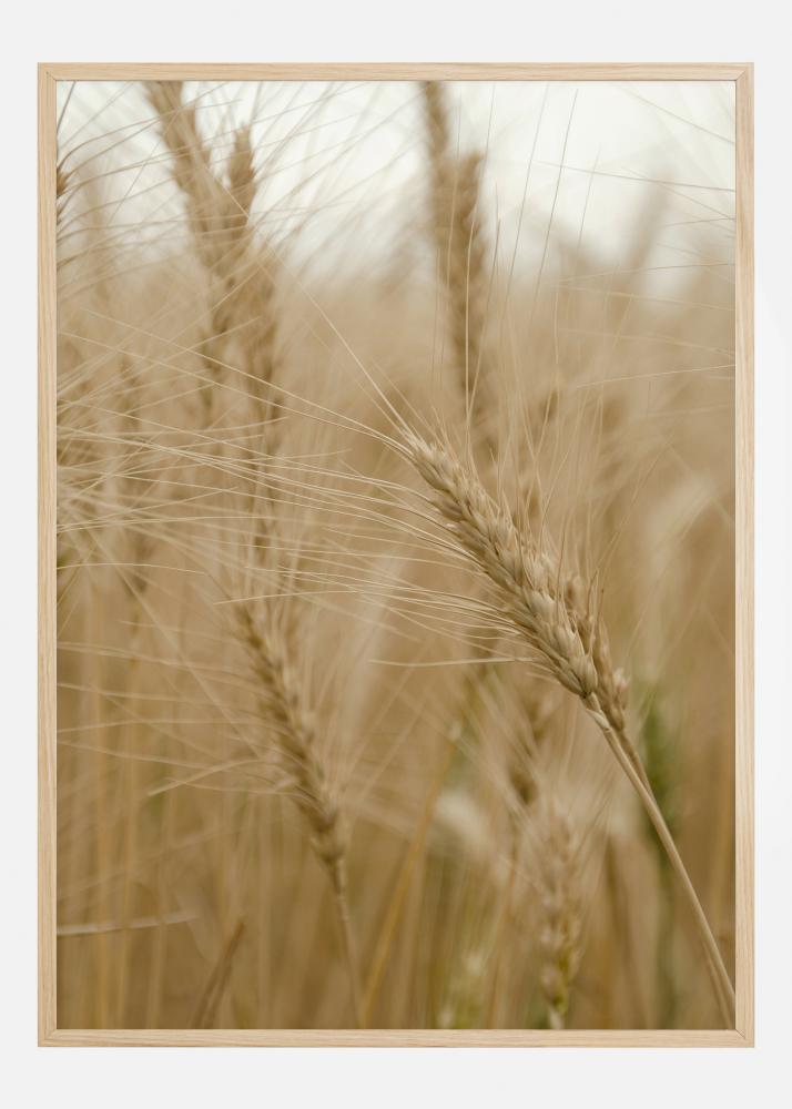 Plakát s detailním záběrem na pšeničné pole. Pšeničná zrna jsou v popředí detailně zobrazena a mají nádhernou zlatou barvu. Směřují do dálky a ukazují, jak velké pole ve skutečnosti je. Nad nimi se rozprostírá bledá obloha. Přineste si přírodu domů s tímto jednoduchým obrazem.