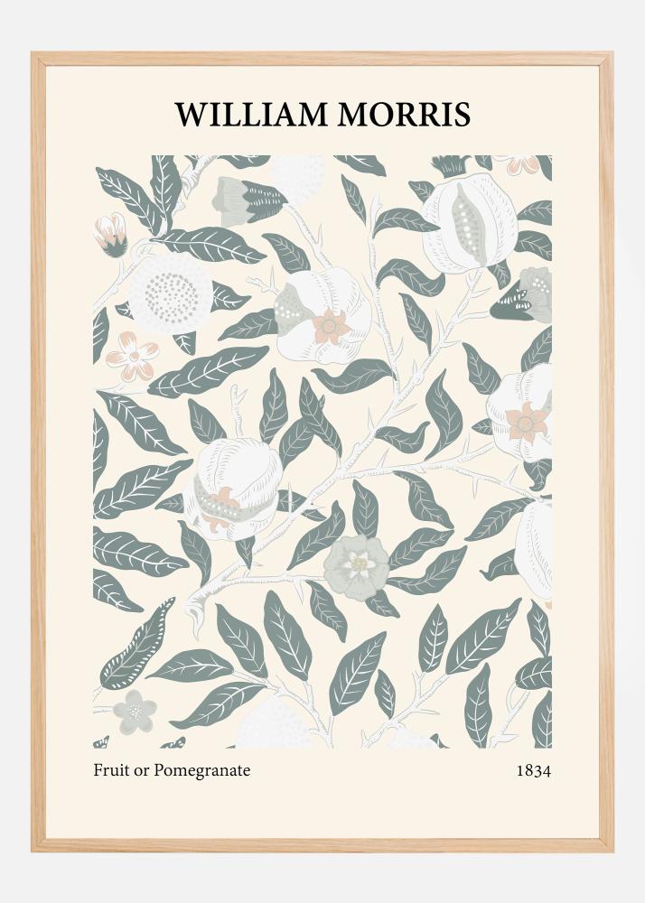 Tento krásný plakát Williama Morrise s názvem "Ovoce nebo Granátové jablko" je potěšením pro oko, bohatý na detaily a plný motivů inspirovaných přírodou. Detailní vzor se skládá z granátových jablek a listí, které jsou pěkně uspořádány k vytvoření organické a plynulé kompozice. Barevná paleta je uklidňující a osvěžující, s odstíny zelené a béžové, které doplňují bělavé plody a květiny. Je to plakát, který si zaslouží výrazné místo v každé místnosti a nabízí kousek tiché elegance přírody pro vnitřní prostředí.