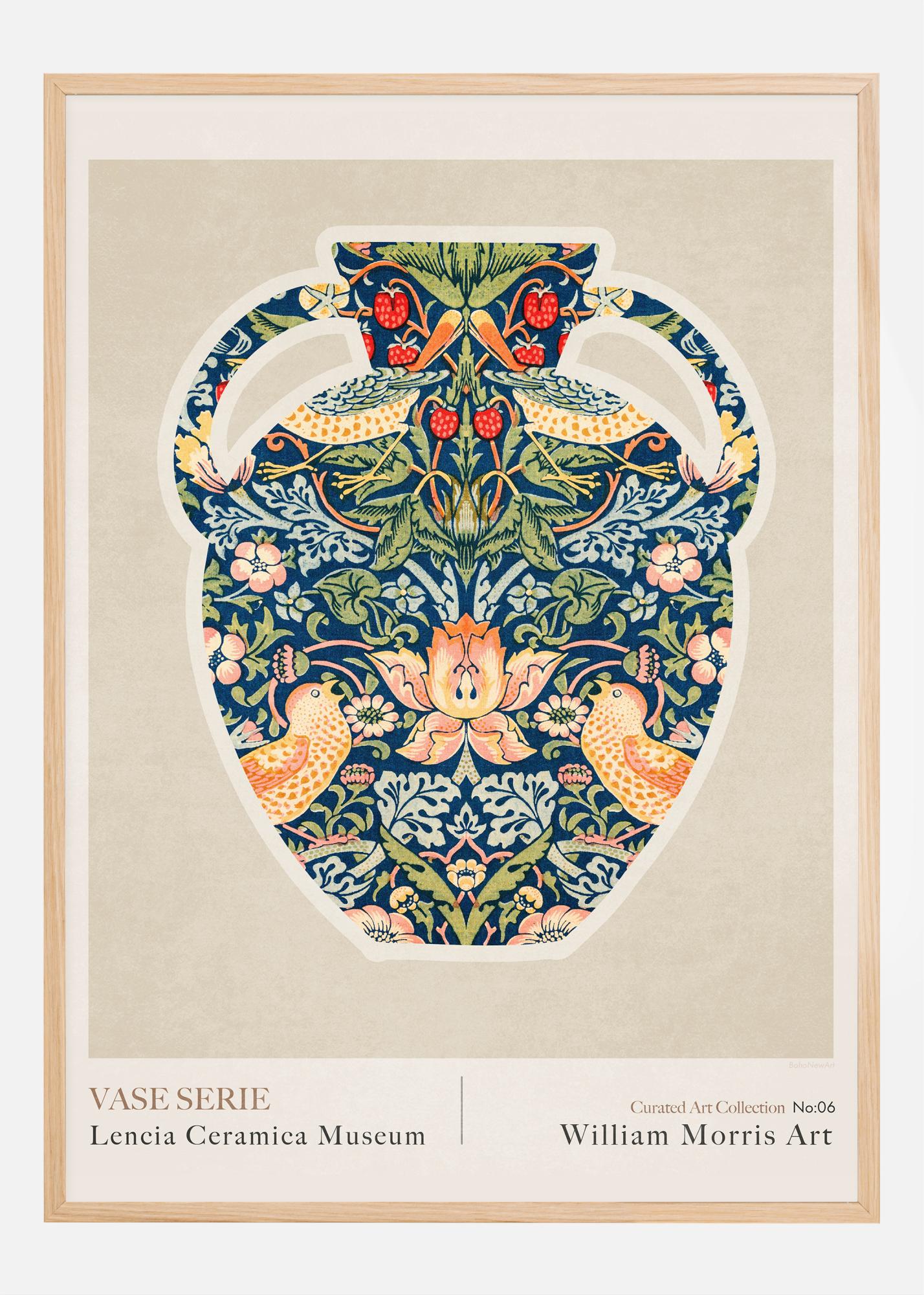 Plakát číslo 06 v naší "Curated Art Collection" v Lencia Ceramica Museum je bohatým poctou řemeslnému umění Williama Morrise. Zobrazuje vázu ozdobenou symetrickým a detailním vzorem, živým s motivy ptáků a květin, které jsou ikonické pro Morrisovu designovou filozofii. Každý prvek v tomto vzoru je promyšlený, aby oslavil krásu přírody a umění, které ji dokáže napodobit.