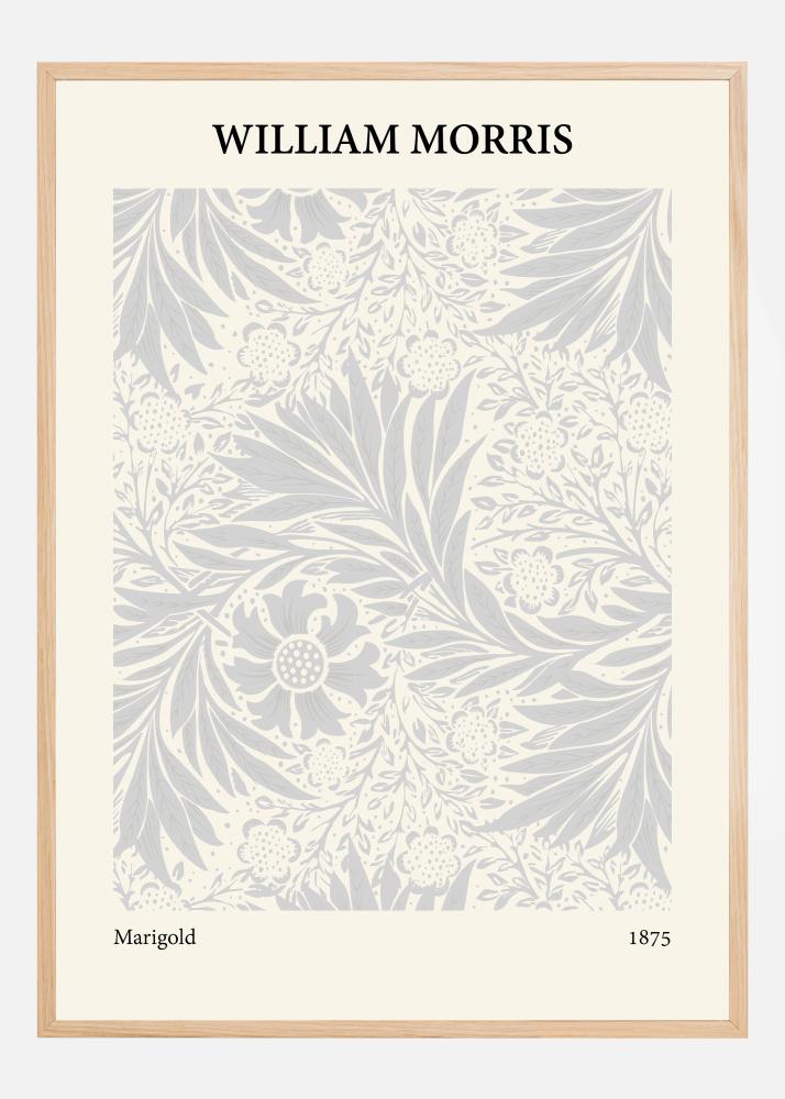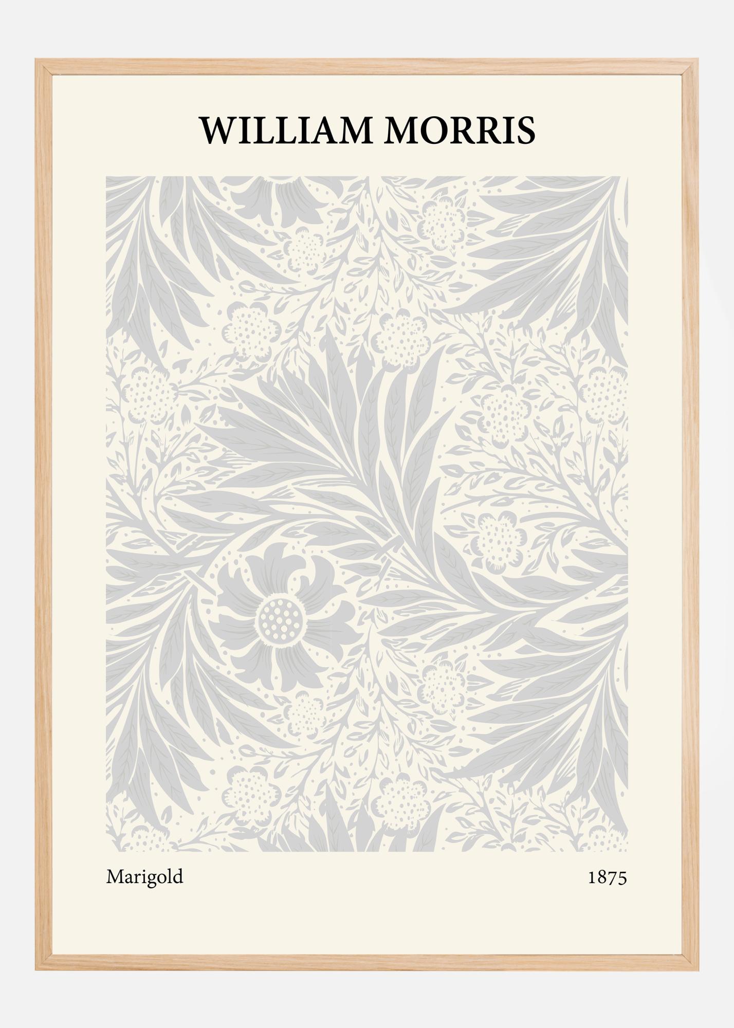 Tento plakát je elegantní ztvárnění "Měsíčku" od Williama Morrise z roku 1875, které vyvolává pocit klidu a přirozené krásy. Design je plný kvetoucích měsíčků a jemného listoví, pečlivě umístěného do symetrického a atraktivního vzoru. Jemná barevná kombinace světle šedých a bílých tónů vytváří měkkou a přívětivou estetiku, která je charakteristická pro Morrisovu práci.