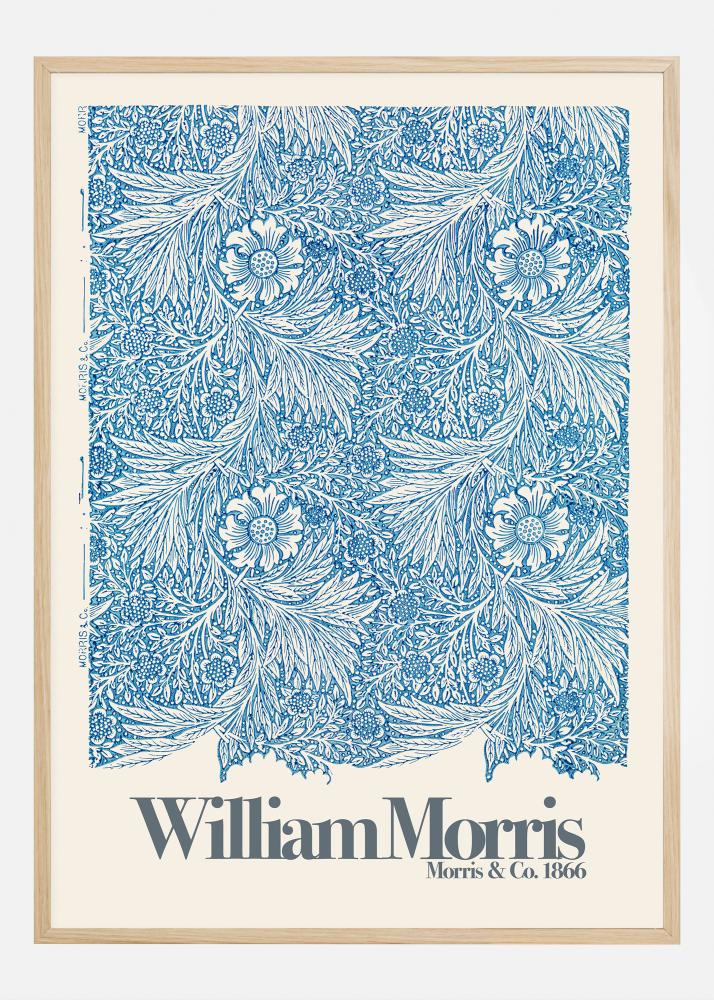 Tento plakát zobrazuje klasický vzor Williama Morrise s názvem "Marigold", vytvořený společností Morris & Co. kolem roku 1866. Ikonický vzor, známý pro své složité a přírodou inspirované prvky, je zobrazen v tmavě modré barvě na čistě krémovém pozadí. Každý detail květinové kompozice je pečlivě vytesán, což ukazuje Morrisův cit pro krásu v přírodním a schopnost přetvářet ji v umělecká díla, která jsou nadčasová a oblíbená dodnes.