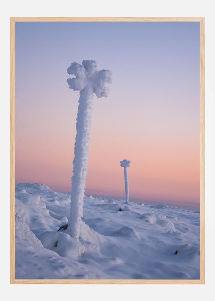 Tento plakát zachycuje snové zimní krajiny, kde se sněhem pokryté útvary zvedají z měkkého, vlnícího se sněhového pole. Motiv vyzařuje klid a minimalismus, s mrazem obalenými sloupy, které téměř připomínají sochy vytvořené přírodou. Obloha nabízí krásný barevný přechod, který obrazu dodává klidný a poetický výraz – ideální jako tisk nebo plakát pro každého, kdo chce doma vytvořit harmonickou a moderní atmosféru.