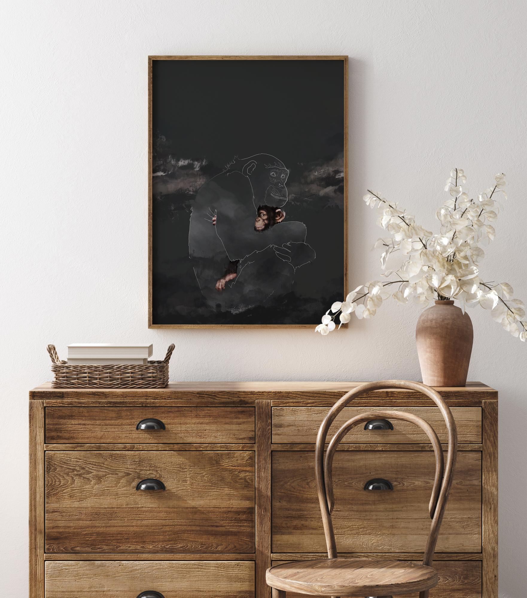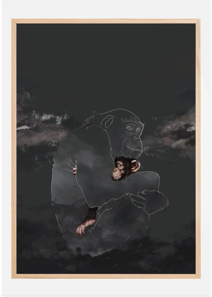 Dojemný plakát s mládětem šimpanze, které objímá chybějící obraz své matky. Toto je působivý obraz, když šimpanzí mládě objímá nic jiného než obrysy své matky, která sedí na měkkých oblacích na černé obloze.