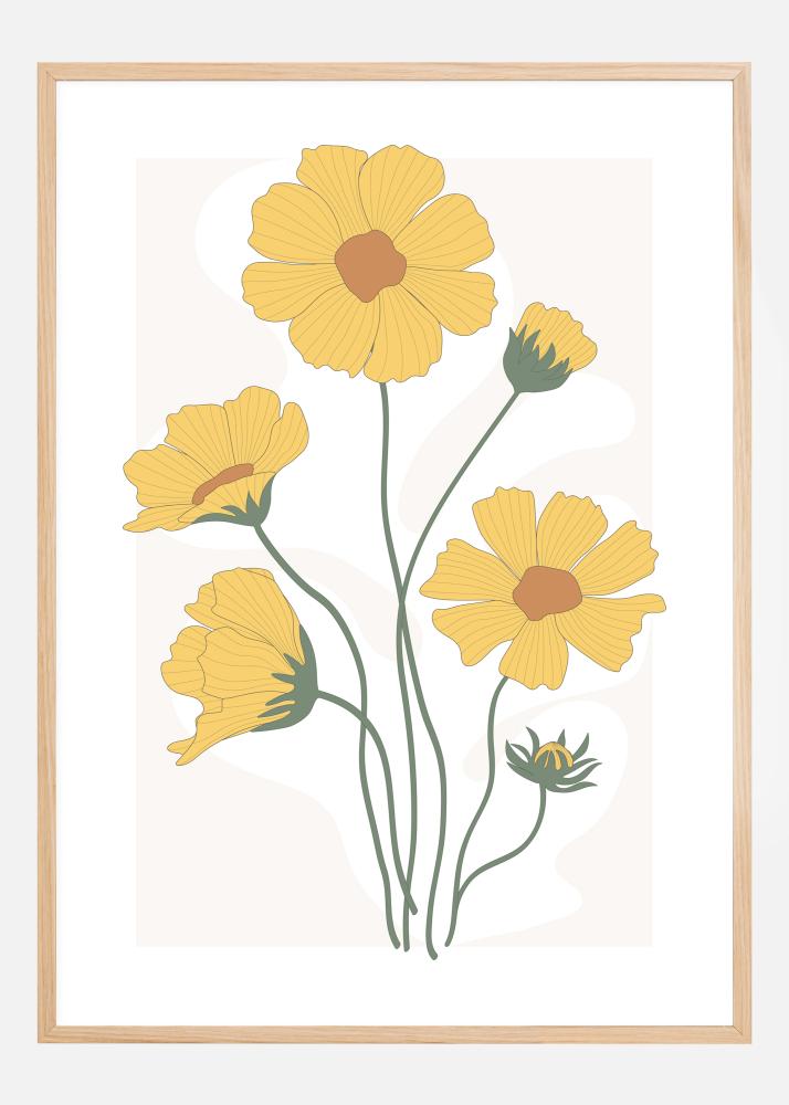 Světlý plakát se žlutými měsíčky, vytvořený v zábavném tiskovém stylu. Každá z květin září proti bílému pozadí. I když jde o jednoduchý stylizovaný design, květiny jsou veselé a představují perfektní způsob, jak se probudit s úsměvem na rtech.