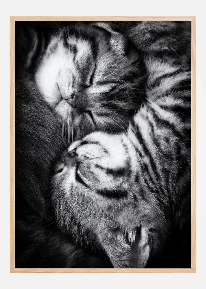 Roztomilý plakát se zvířaty se dvěma spícími koťaty. Pořiďte si tento tisk a užijte si pocit objetí, když se díváte na tyto roztomilé, objímající se kočky.