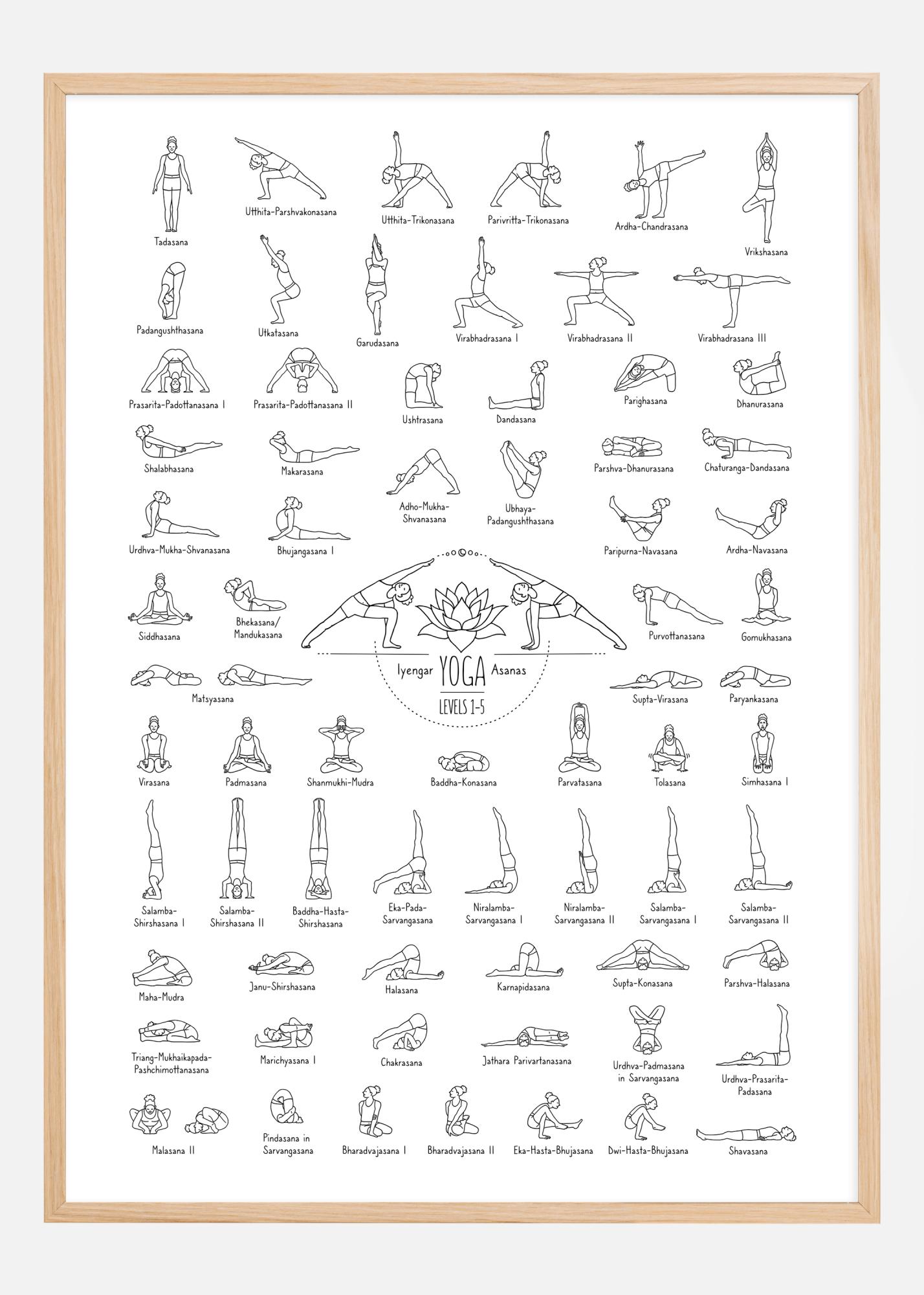 Centrální část plakátu je věnována Iyengar jógovým ásánám pro úrovně 1-5, což naznačuje progresi v praxi. Tento tisk je nejen funkční, ale také esteticky přitažlivý a hodí se skvěle do jógového studia, domácího posilovny nebo jako zdroj inspirace v relaxačním koutě domova. Jeho minimalistický černo-bílý design ho činí kompatibilním se širokou škálou interiérových stylů, zatímco šíří pocit klidu a soustředění.
