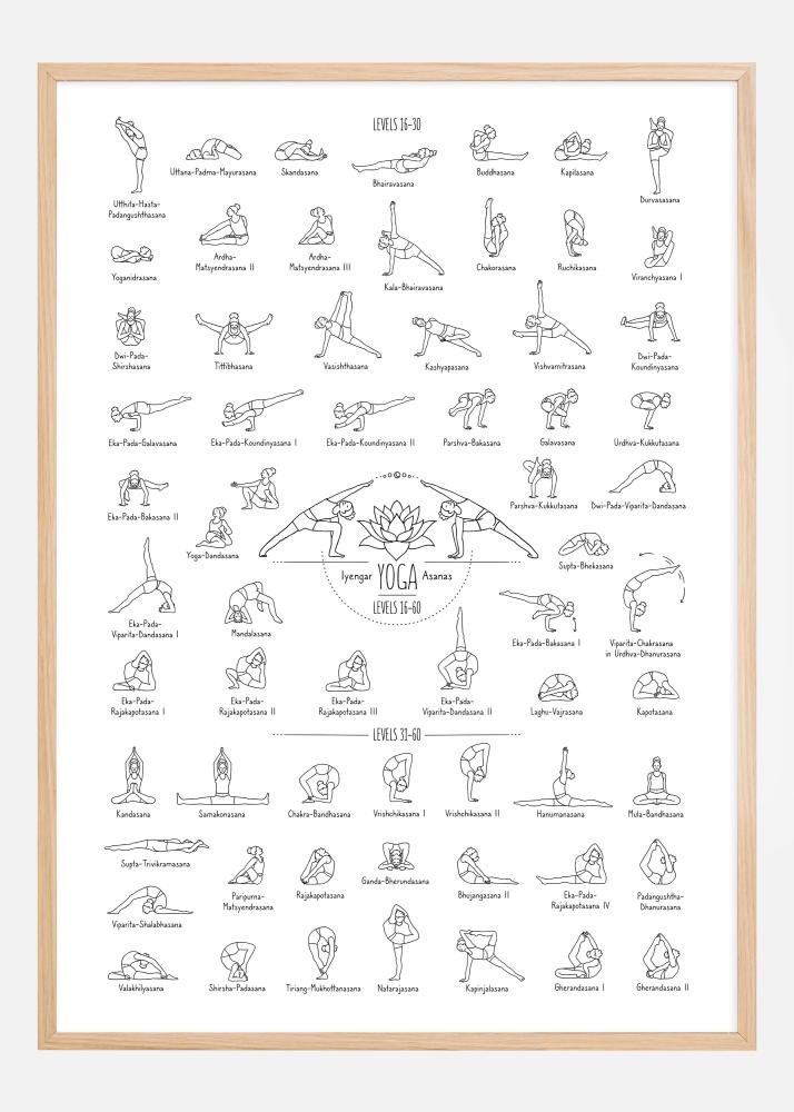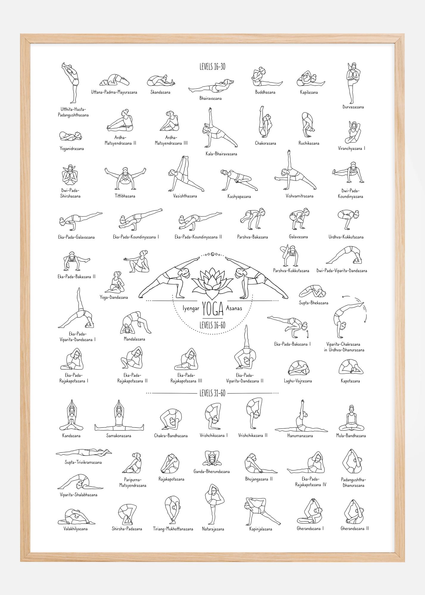 Ve středu a v centru plakátu je nápis 'Iyengar YOGA Asanas' a úrovně obtížnosti, což naznačuje, že tato cvičení pocházejí ze specifické formy jógy, kterou vyvinul B.K.S. Iyengar. Tento vzdělávací plakát je ideální pro jogíny, kteří chtějí prohloubit svou praxi, i pro instruktory, kteří potřebují vizuální referenci ve svých studiích. Jeho čistý a jednoduchý design z něj činí elegantní a funkční dekoraci, zatímco přispívá inspirativní a vzdělávací atmosférou v místnosti.