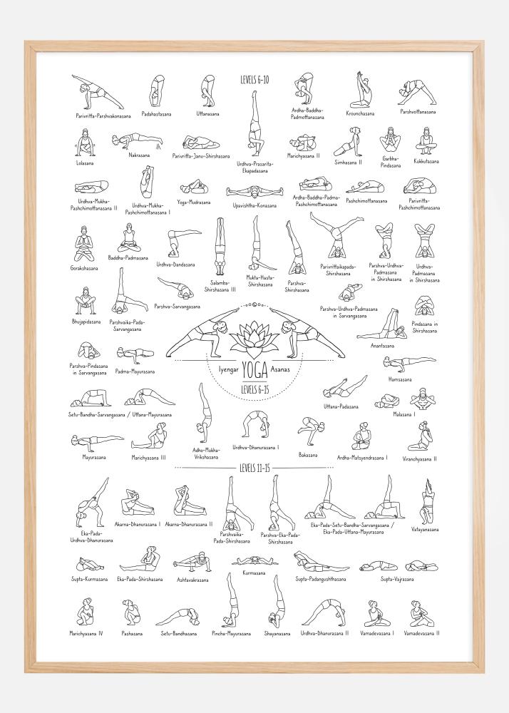 Tento rozsáhlý a instruktivní plakát poskytuje vizuální návod pro Iyengar Yoga Asany pro úrovně 6 až 15, prezentovaný v jasném a metodickém rozvržení. Detailní ilustrace jsou vykresleny s přesnými liniemi, které zdůrazňují jedinečné tvary a pozice každé jógové pozice. Nad každým obrázkem je uveden název asány v sanskrtu, což umožňuje praktikantům všech úrovní snadno identifikovat a cvičit každou pozici.