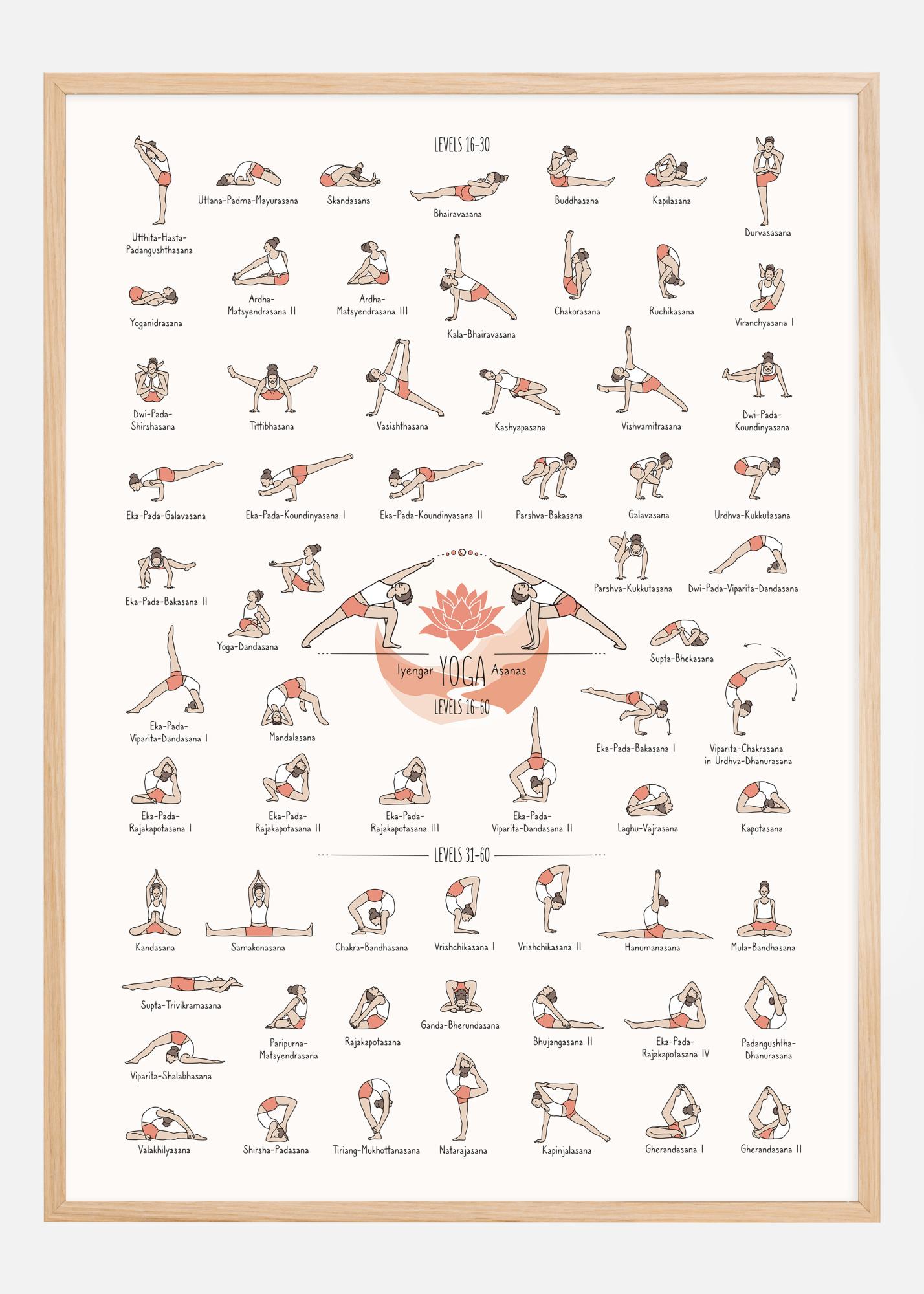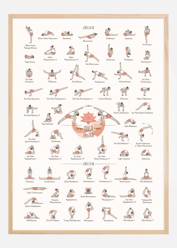 Tento barevný a poučný plakát je průvodcem pro Iyengar Yoga Asanas, zaměřený na ty, kteří jsou na středně pokročilé až pokročilé úrovni, úrovně 16 až 30. Ásany jsou ilustrovány paletou zemitých barev, které zvýrazňují jedinečný tvar a strukturu každé pozice. Cvičení jsou pečlivě očíslována a pojmenována v sanskrtu, aby vyhovovala širokému publiku.