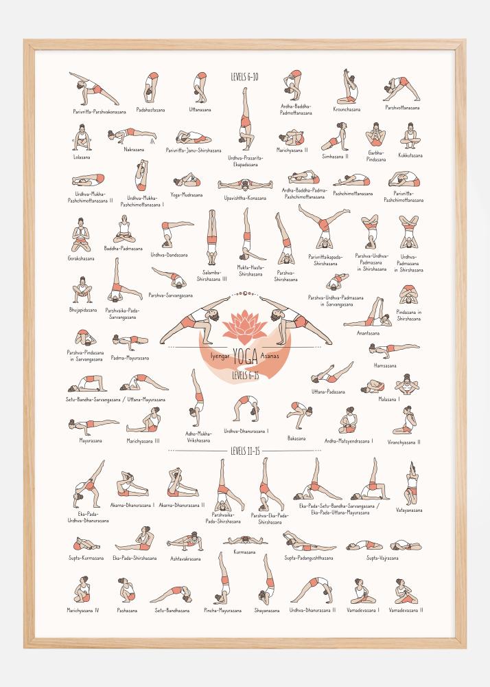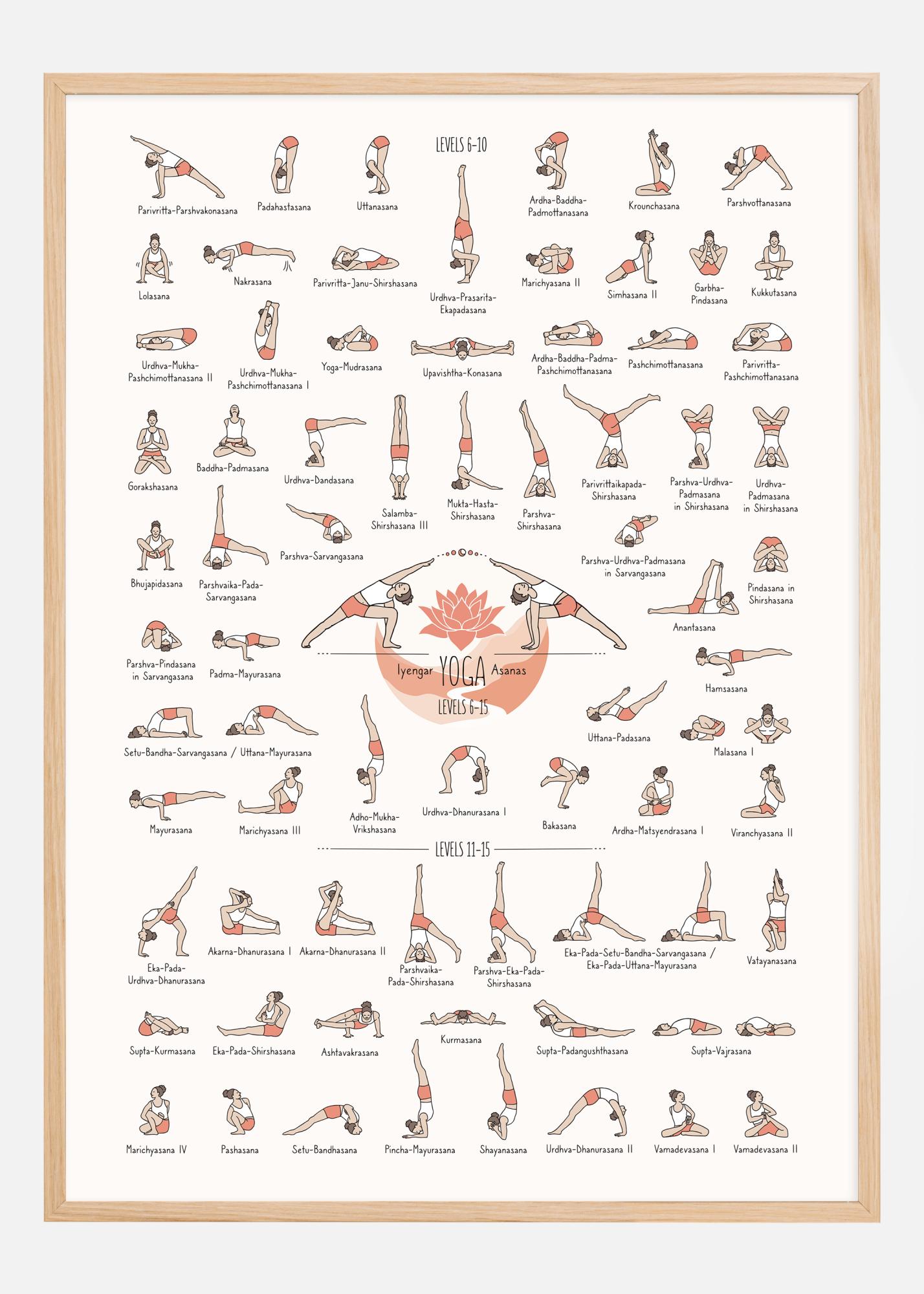 Tento podrobný a barevný plakát jógy ilustruje rozsáhlou sbírku Iyengar Yoga ásan od úrovně 6 do 15. Každá jóga pozice je krásně ilustrovaná teplými, příjemnými barvami, které zvýrazňují každou formu a gesto, zatímco jasně identifikovatelná jména vedle každé ilustrace usnadňují sledování a cvičení. Design je jak funkční, tak estetický a vytváří příjemnou atmosféru pro praktikující jógy všech úrovní znalostí.