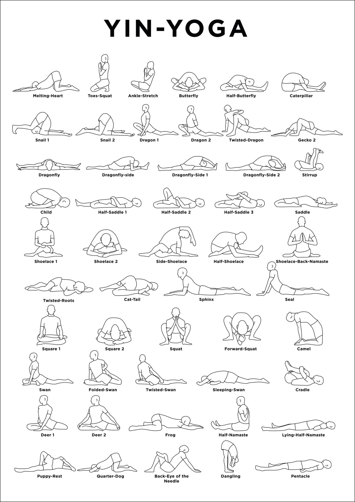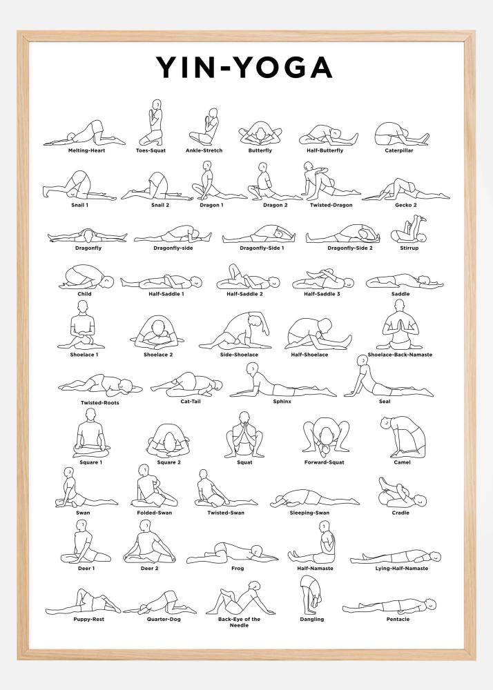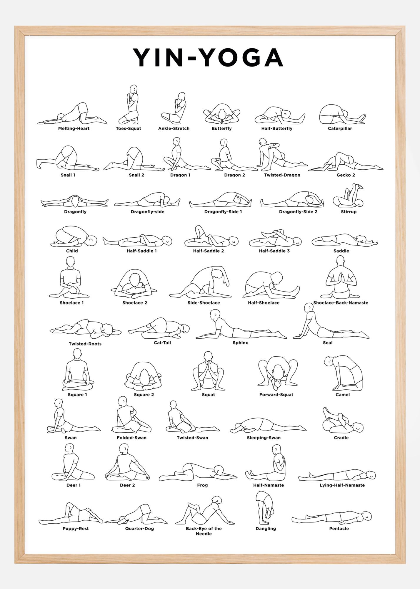 Zábavný designový plakát, který zobrazuje různé jógové pozice, které se můžete naučit. Bílý obrázek má každou postavu nakreslenou černou barvou, jak sedí nebo leží v různých pozicích, s napsaným názvem pod nimi. Zavěste si ho tam, kde ho doma uvidíte, a následujte každou pozici, abyste se správně protáhli.