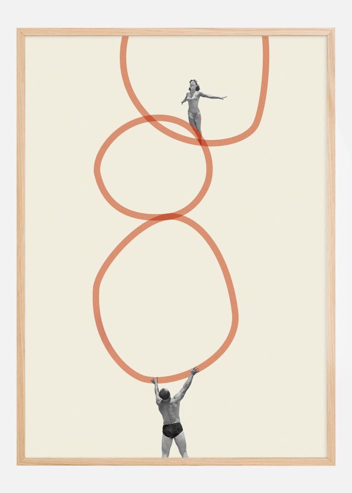 Tento jedinečný plakát představuje kompozici, která připomíná tanec kontur a lidskou interakci. Obrázek ukazuje osobu v půvabném pohybu, kterou vyvažuje jiná figura stojící silně a pevně na zemi, obě orámovány tekoucími terakotově červenými kruhy, které vytvářejí pocit pohybu a kontinuity.