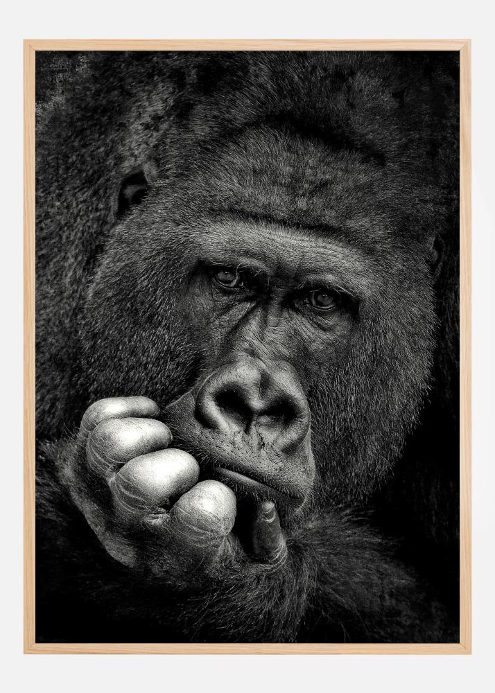 Úžasný portrét plakátu gorily v zamyšlené póze. Gorila se dívá s neostrým pohledem na kameru. Jedna ruka je ohnuta pod bradou, jako by přemýšlela nad důležitými otázkami. Černobílý tisk zvýrazňuje všechny detaily v obličeji tohoto naprosto úžasného lidoopa.