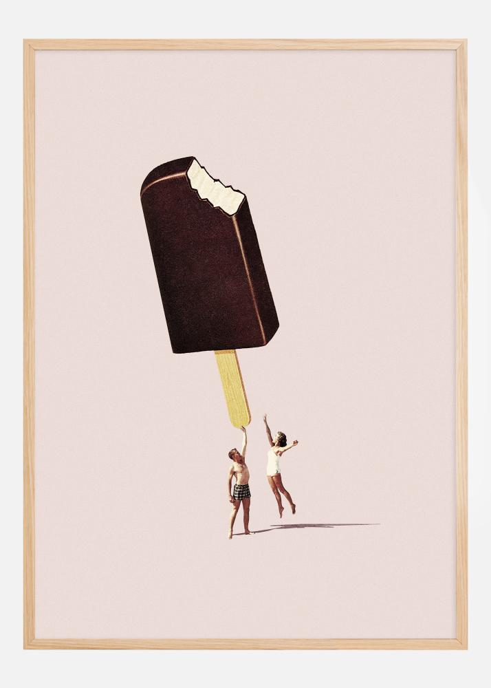 Tento okouzlující plakát zobrazuje jedinečný a hravý obraz dvou osob, které se zdají, že našli obří nanuk! Svou fantazijní kompozicí a teplým pastelově růžovým pozadím nabízí tento obraz pocit letní radosti a nostalgie. Veselé postavy, oblečené v jednoduchých plavkách, sahají po nanuku, který má realistický vzhled s vykousnutým kouskem, a vytváří tak půvabný kontrast k minimalistickému okolí. Tato kreativní a živá scéna upoutává pozornost pozorovatele a vyvolává vzpomínky na slunné dny.