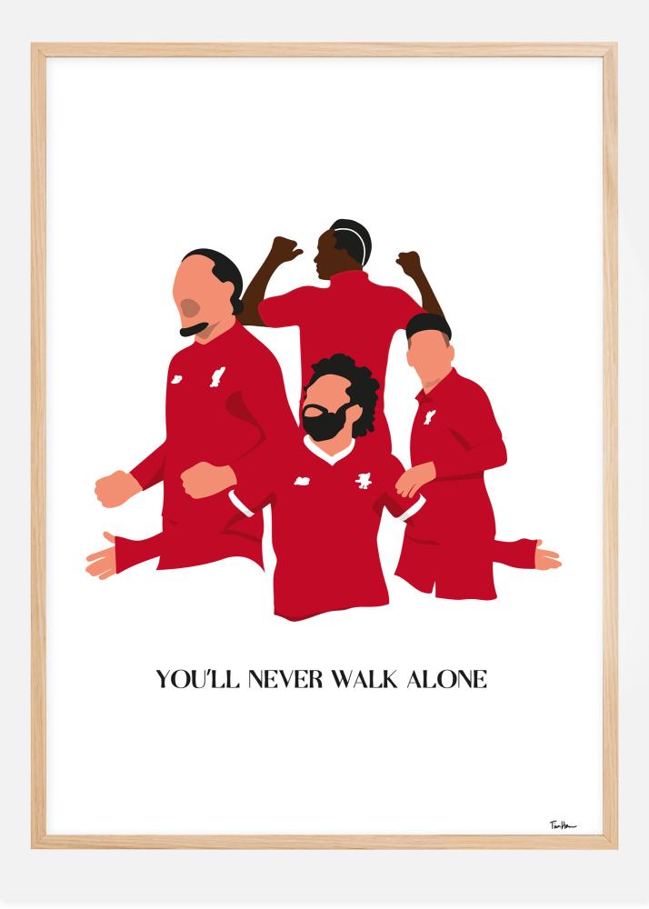 Plakát s fotbalisty s vyobrazením čtyř hráčů Liverpoolu ve stylizované podobě v jejich červených dresech. Pod hráči stojí slova You'll Never Walk Alone, motto klubu a také důležitý citát v životě, který je ideální k tomu, aby vás každé ráno motivoval.