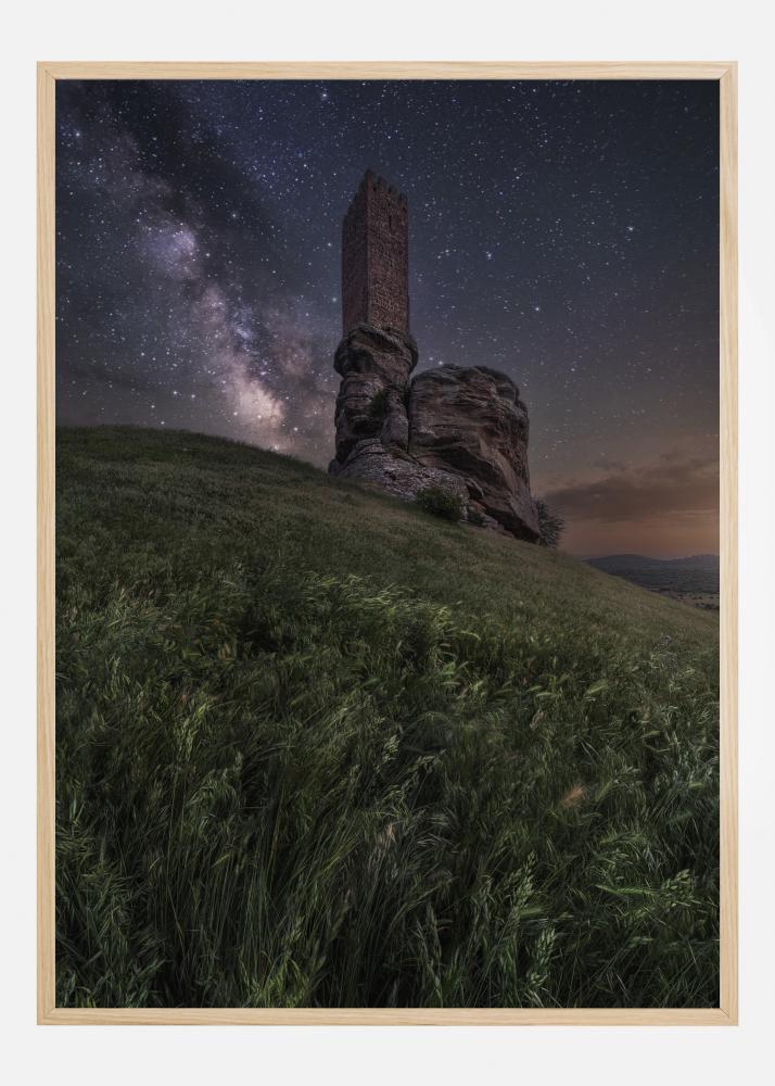 Velkolepý plakát s hradem Zafra v noci. Podívejte se na tuto starou kamennou konstrukci z úpatí travnatého kopce. Věž se tyčí k noční obloze, kde Mléčná dráha tvoří oblouk přes nebe. Tento krásný obraz bude vypadat skvěle na jakékoli stěně ve vašem domě a přidá i dotek magického.
