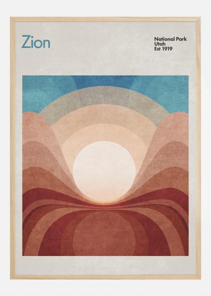 Tento plakát zachycuje majestátní přírodu Zion National Park se stylizovanými vrstvami krajiny, které vytvářejí abstraktní interpretaci ikonických skalních formací a rozsáhlých výhledů parku. Text "Zion National Park Utah Est 1919" poskytuje historický kontext a vzdává hold dědictví parku jako národní poklad od počátku 20. století.