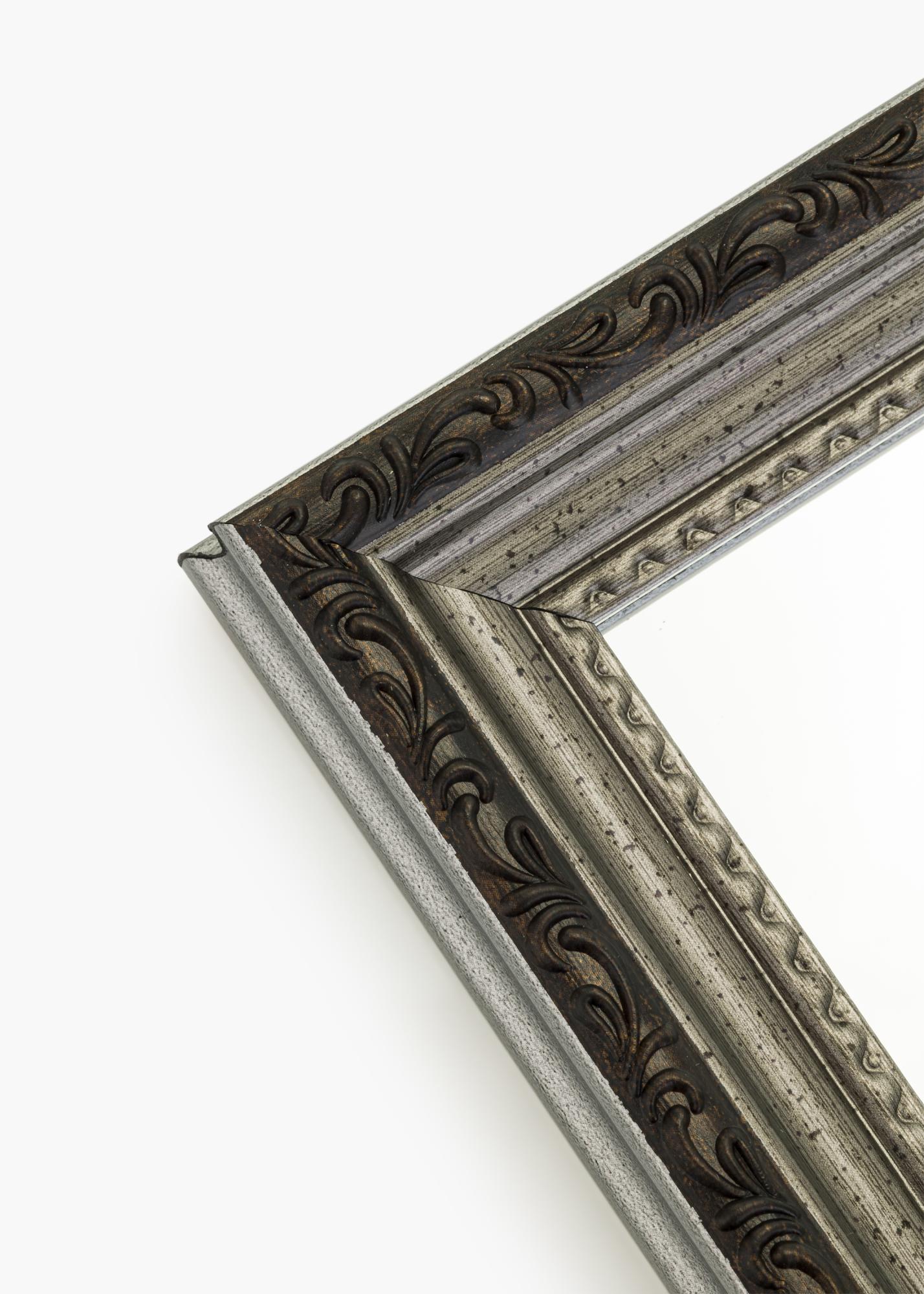 Toto je nástěnné zrcadlo v elegantním stříbrném odstínu, který je zvýrazněn černým okrajem. Elegantní odstín zrcadla je dokonale kombinován s ornamentovaným profilem, jehož vzor pomáhá vytvářet velmi sofistikovaný celek. Rám je 25 mm široký a je vyroben z kompozitu.