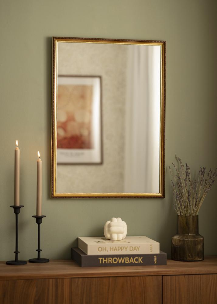 Abisko Gold je nástěnné zrcadlo pro ty, kteří hledají dekorativní zrcadlo s elegantním retroinspirovaným vzhledem. Zrcadlo má 25 mm široký rám s hnědým odstínem a exkluzivní zlatou barvou blízko zrcadlového skla. Rám má krásný zdobený profil, což činí nástěnné zrcadlo velmi stylovou nástěnnou dekorací, která se dobře hodí jak do předsíně, tak do ložnice.