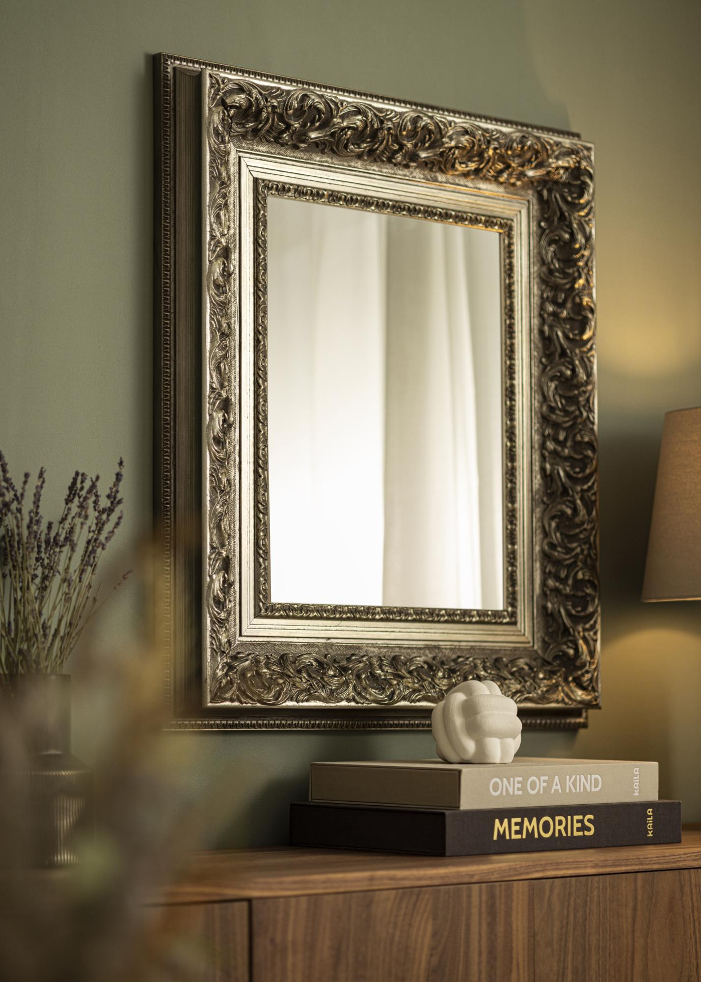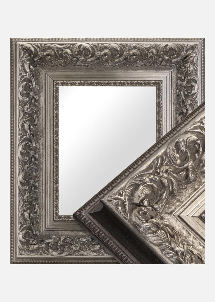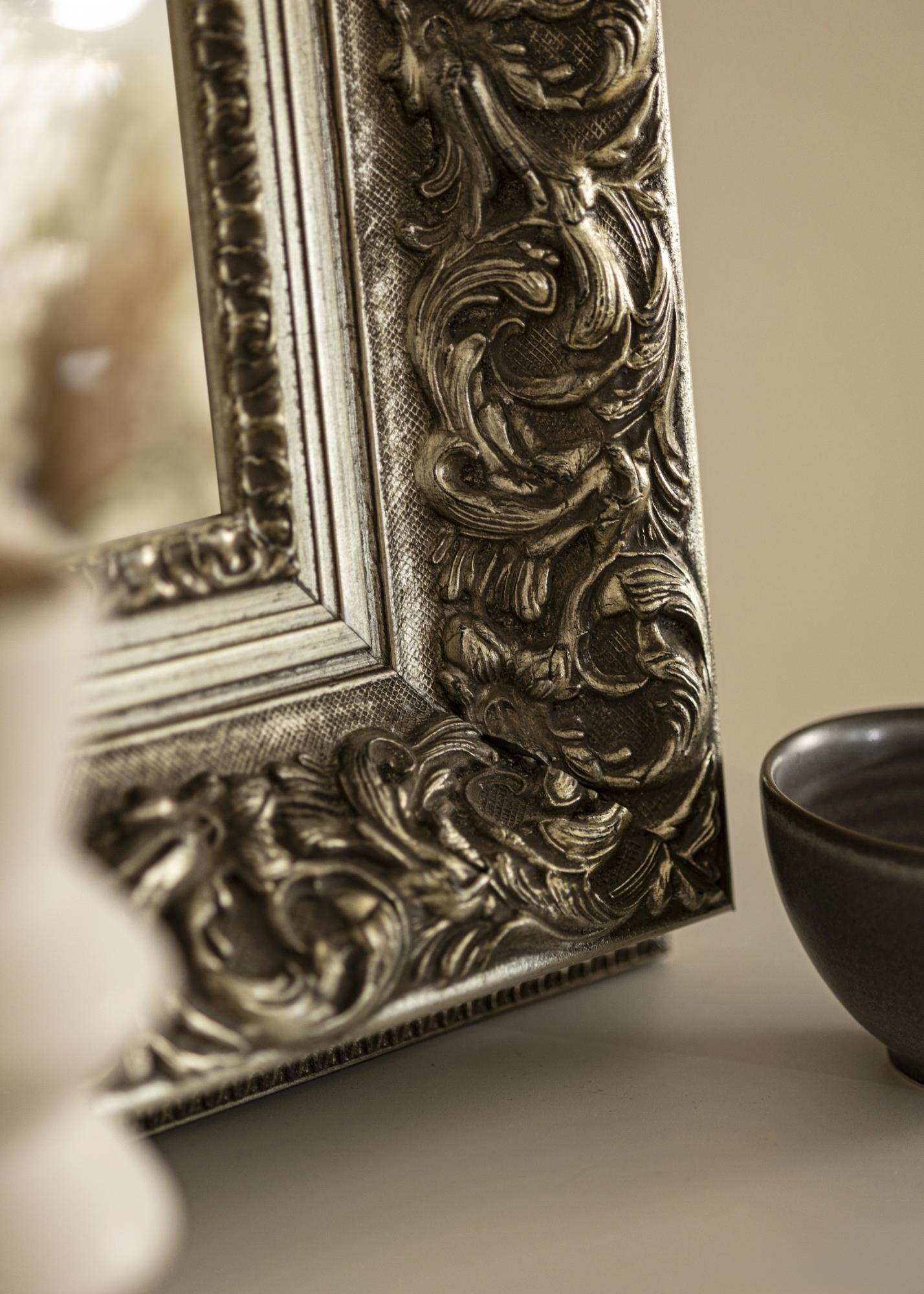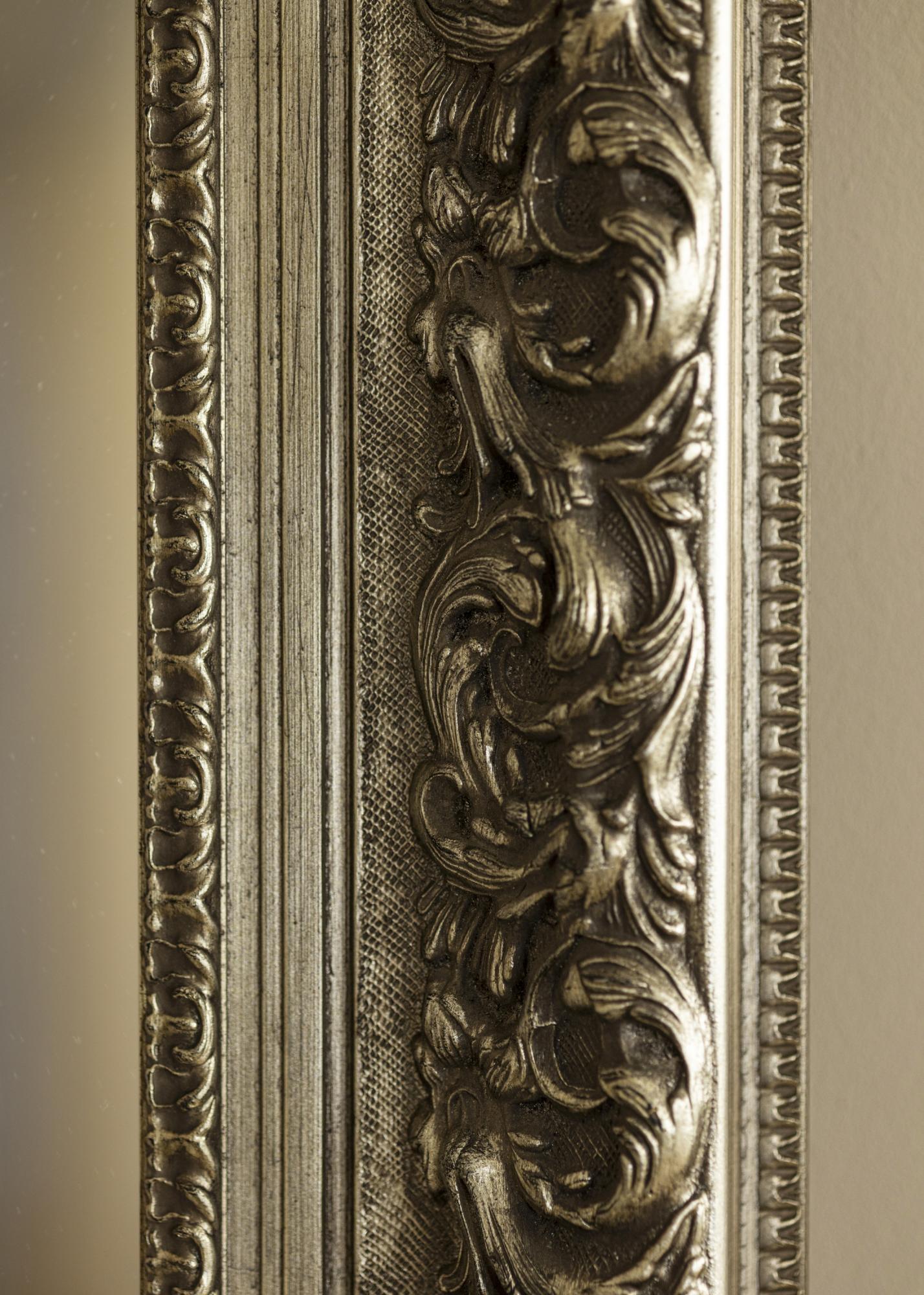 Detailní propracovanost rámu zrcadla je zdůrazněna hlubokým reliéfem, kde vyřezávané vzory listů vytvářejí dojem elegance a stylu. Povrchová úprava rámu kombinuje tmavé a světlé stříbrné tóny, což zrcadlu dodává krásnou patinu a nadčasovou estetiku. Tato kombinace barev a vzorů činí zrcadlo perfektní volbu pro klasické motivy a rámování vyžadující něco navíc.