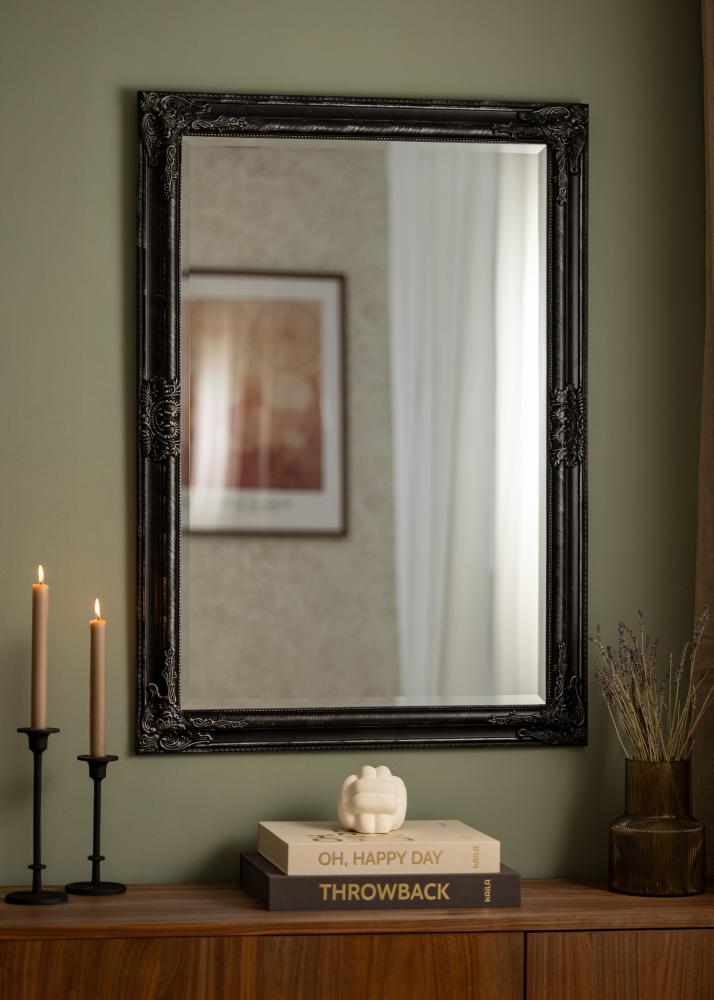 Zrcadlová série Bologna Černá má latinský design s bohatou dekorací v rozích a ve středových bodech rámových stran. Rám je o něco užší než u mnoha jiných zrcadel v tomto stylu. Rám je vyroben ze dřeva a dekorace byla odlita ze sádry před jejím aplikováním na rám.