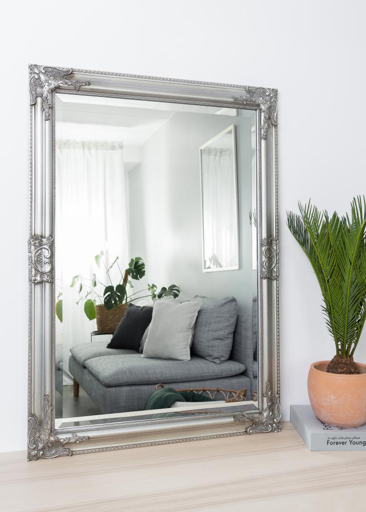 Zrcadlová série Bologna Silver má latinský design s bohatou dekorací v rozích a ve středových bodech stran rámu. O něco užší rám než mnoho jiných zrcadel v tomto stylu. Rám je vyroben ze dřeva a dekorace byla odlita ze sádry, než byla aplikována na rám.