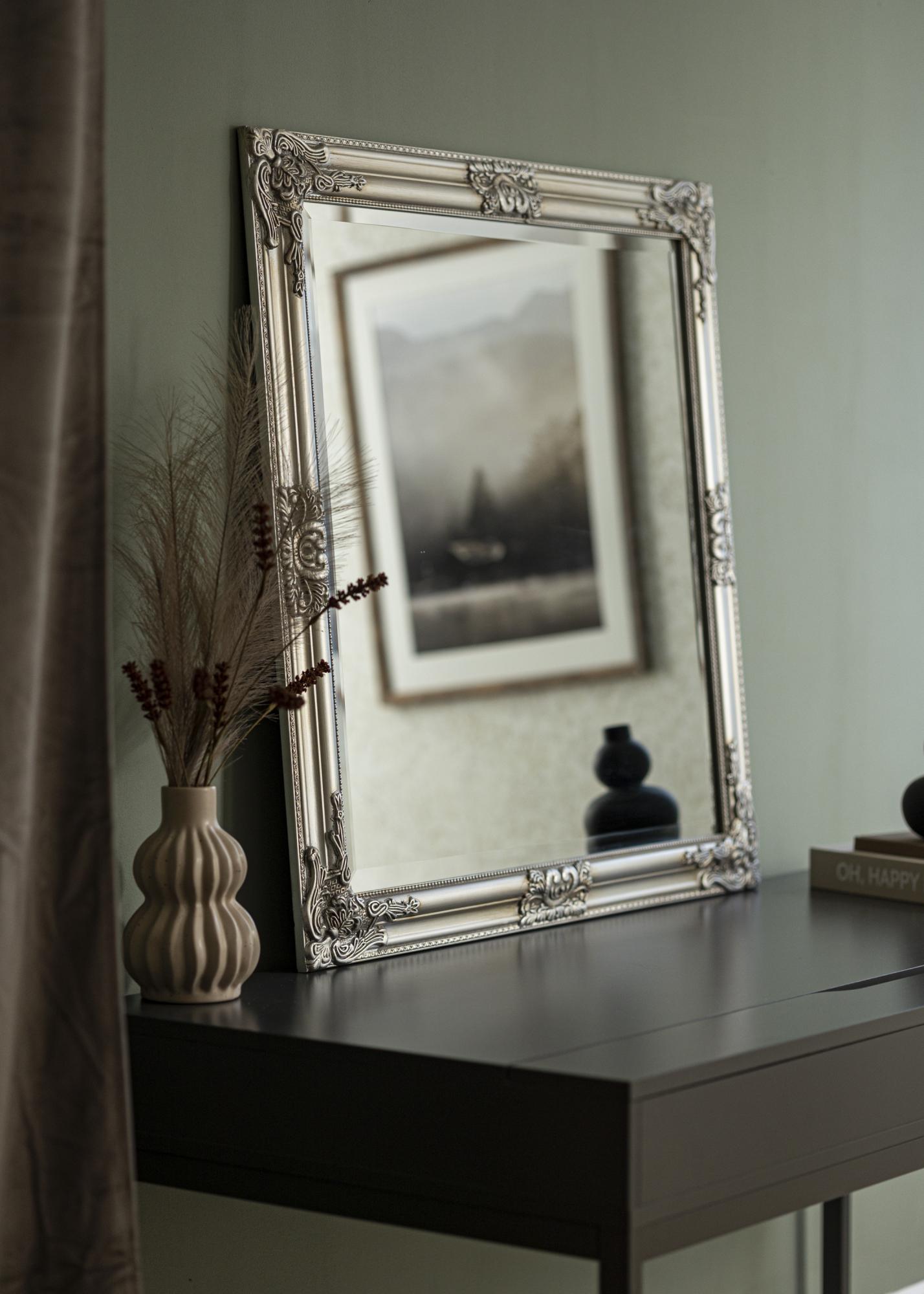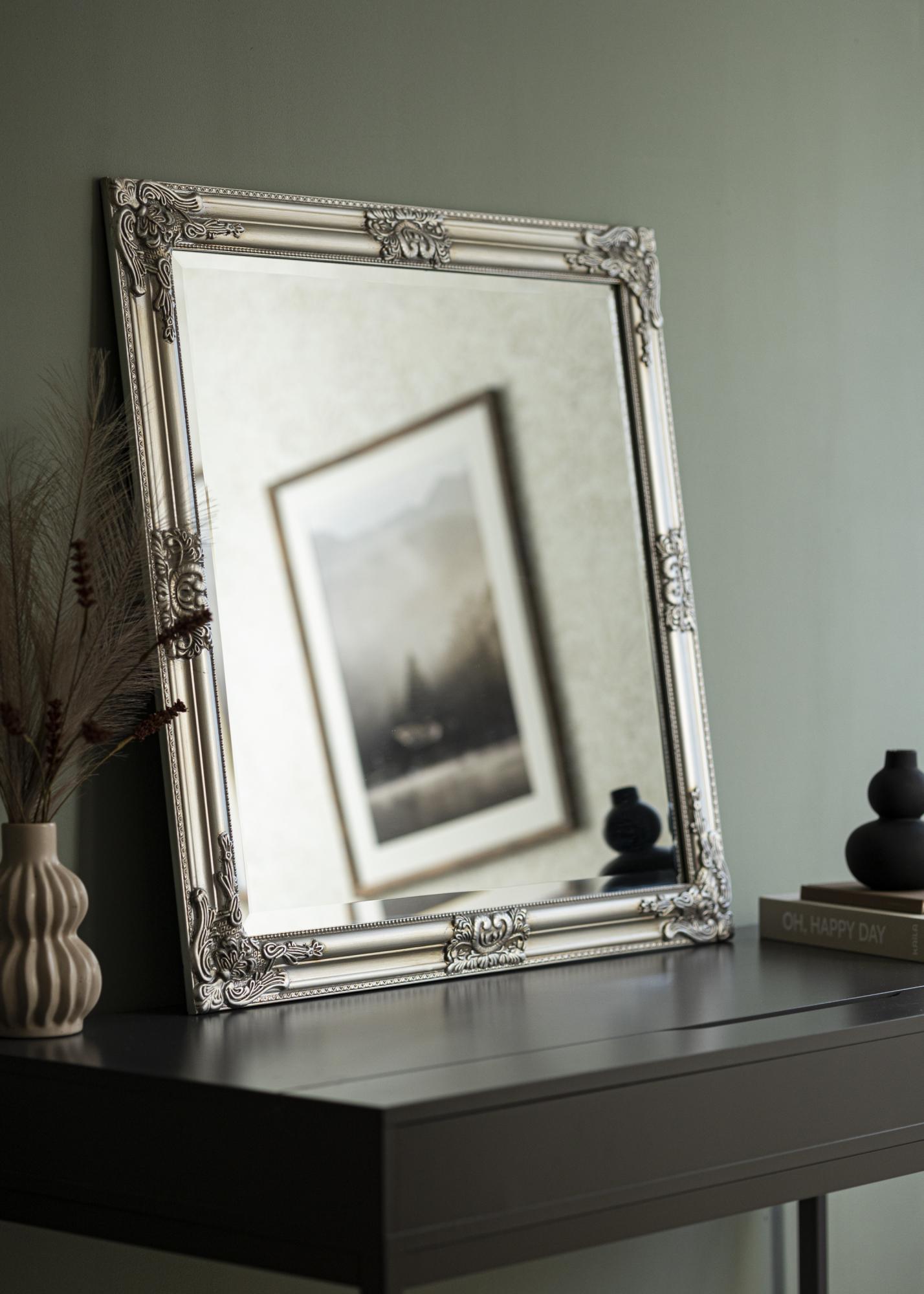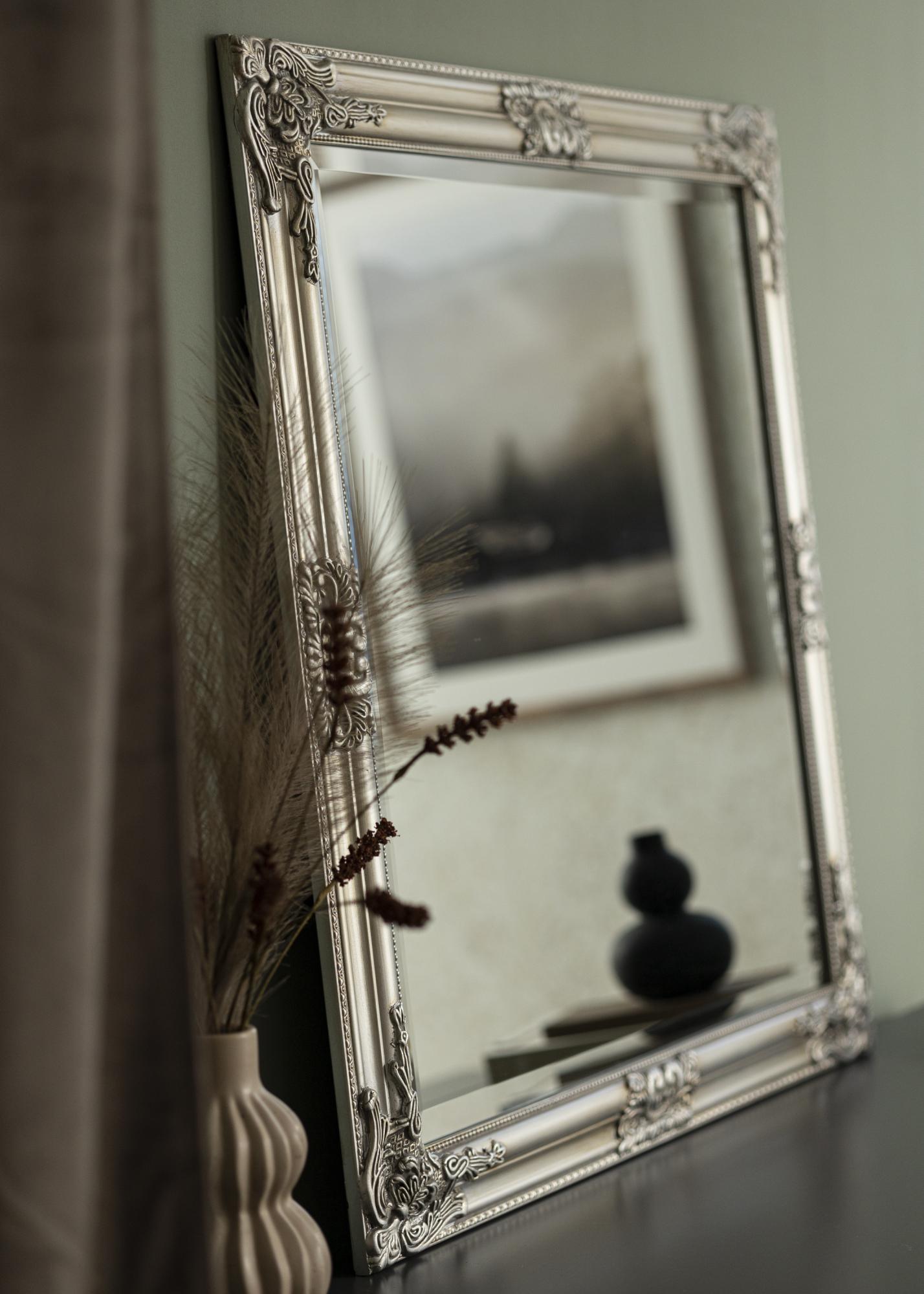 Rám tohoto zrcadla je skutečný poutač, bohatý na detaily ornamentu v barokním stylu, který přidává luxusní a historický pocit do místnosti. Čtvercový tvar zajišťuje symetrickou a vyváženou estetiku, která doplňuje většinu stylů interiéru. Stříbrný rám zrcadla posiluje jeho elegantní vzhled a činí z něj univerzální prvek v domácnosti.