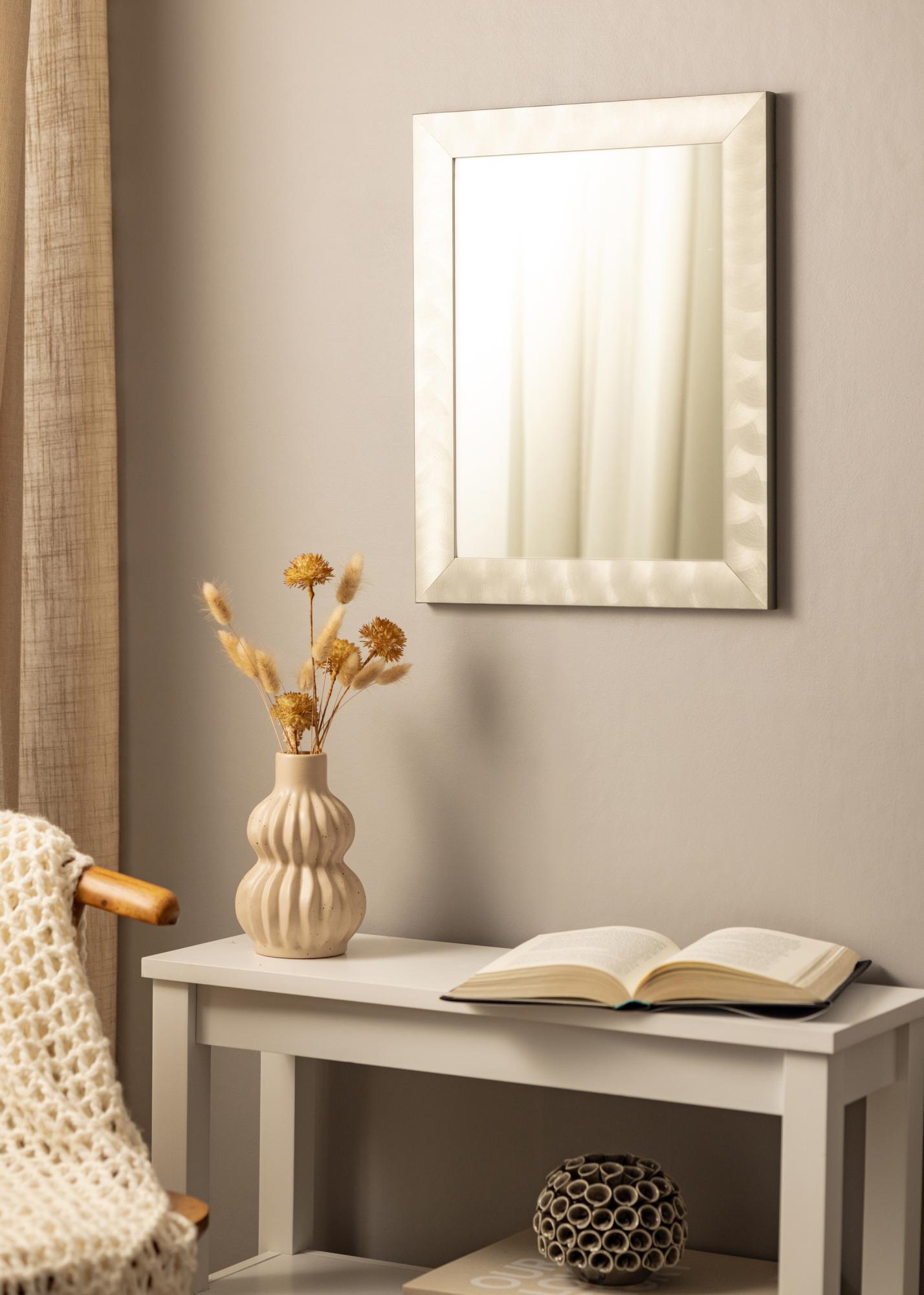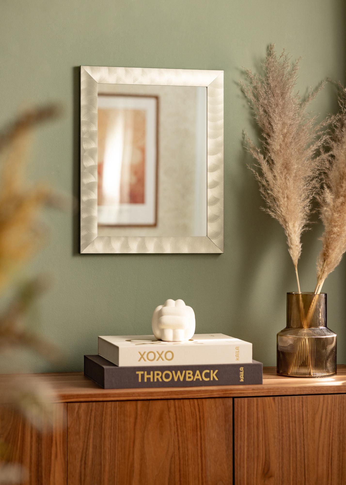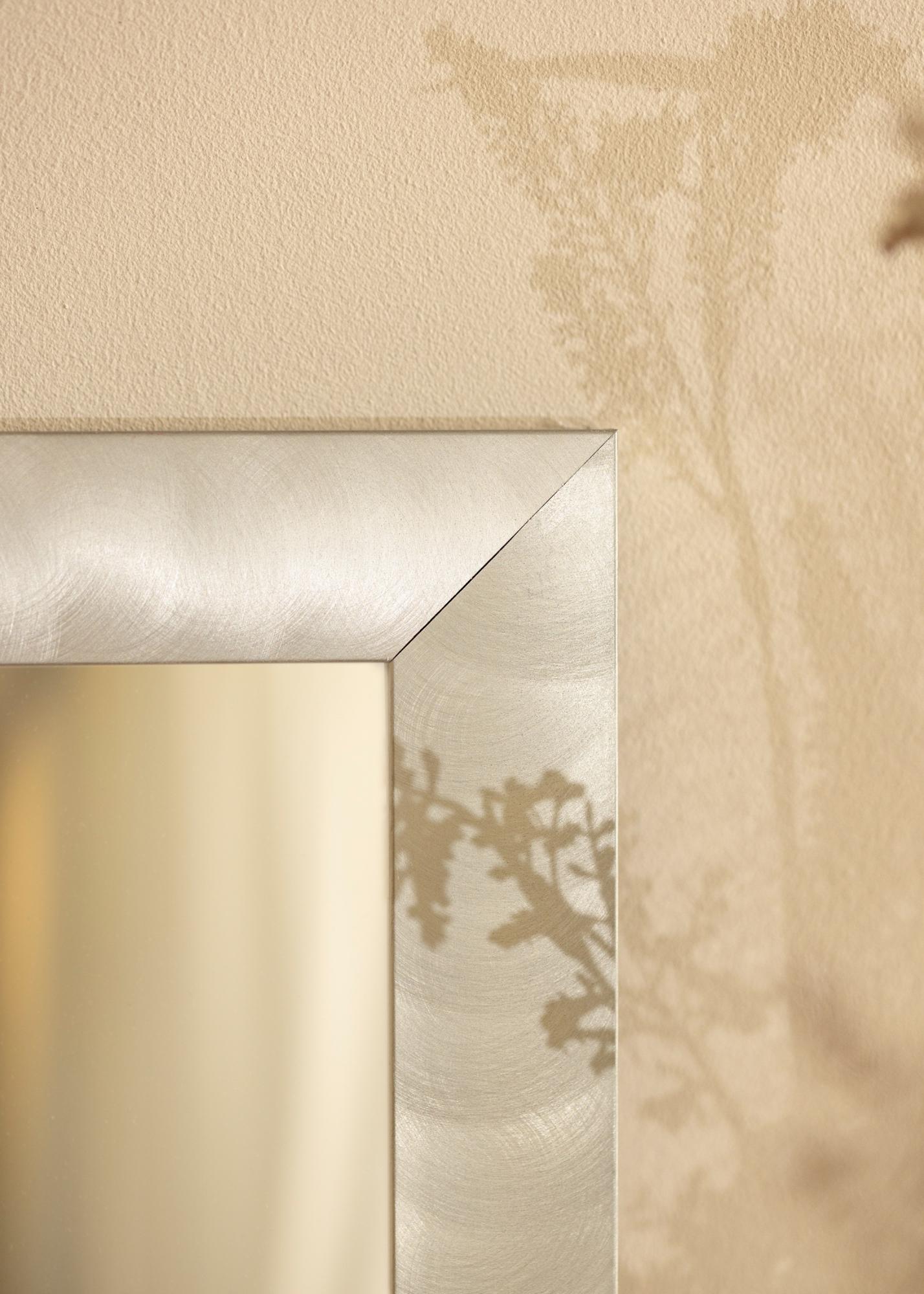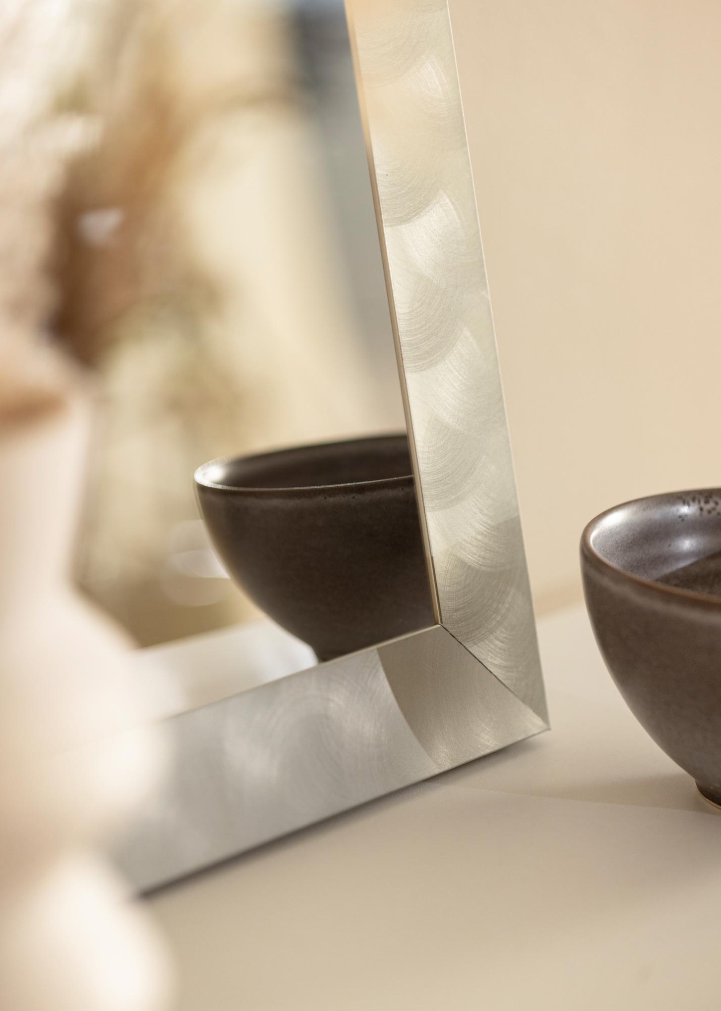 Diskrétní zrcadlo s hladkým širokým rámem vyrobeným v Německu z vysoce kvalitního hliníku. Rám má vzhled světle živé oceli a díky svému čistému designovému jazyku se zrcadlo hodí jak do minimalistického, tak venkovského domova a zapadne do všech typů místností. Zavěste zrcadlo v místnosti s obrazy, které mají rámy ve stříbrné nebo černé barvě, a kombinujte s doplňky v šedém měřítku, abyste udrželi interiér sjednocený.