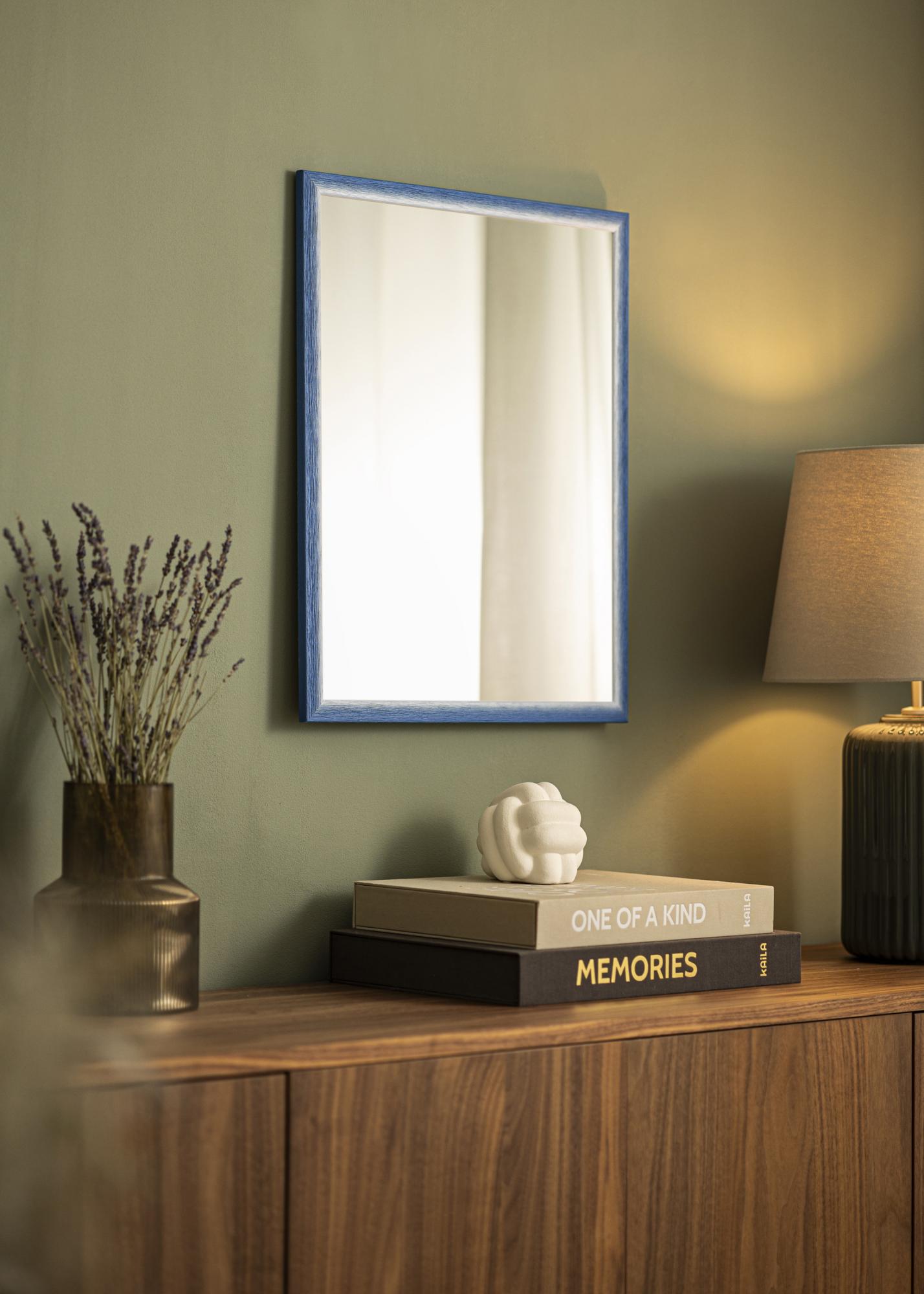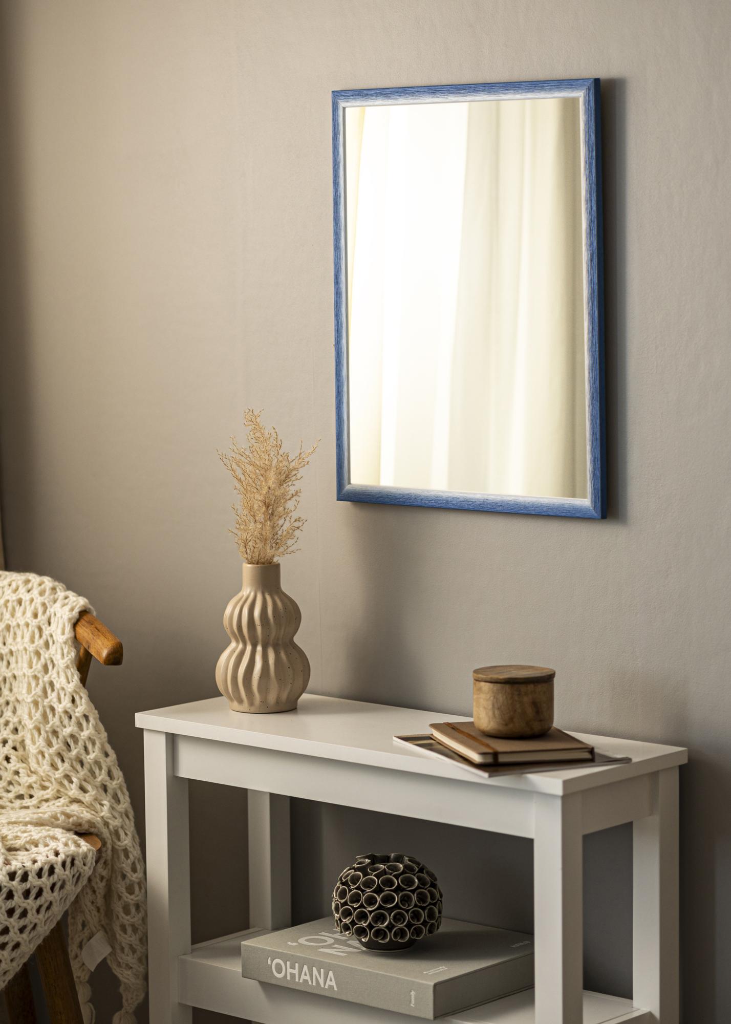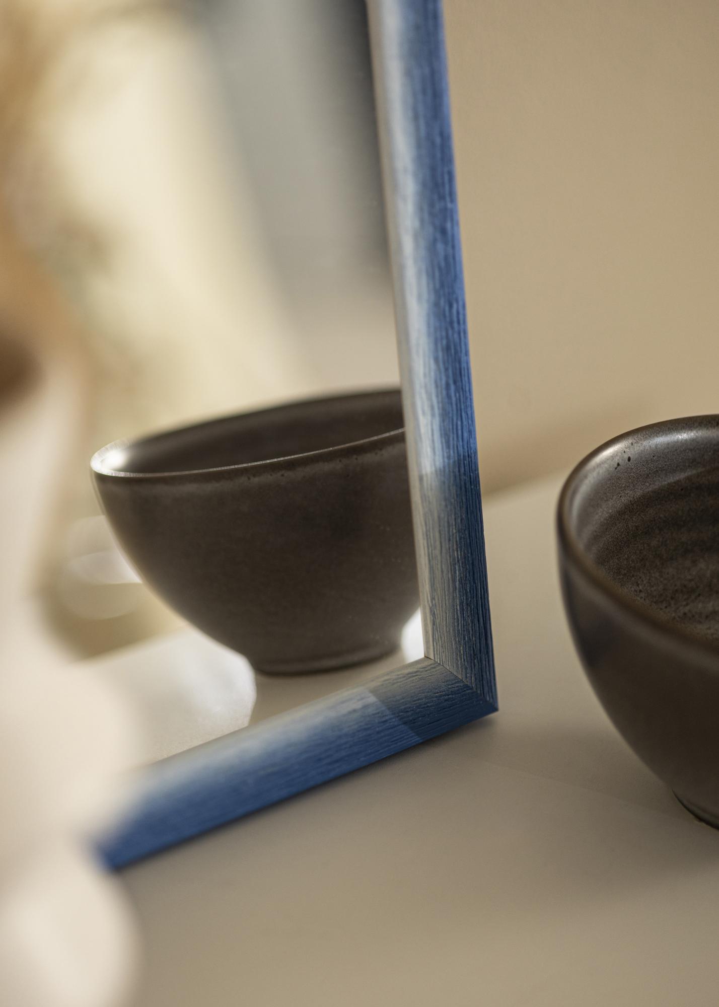 Toto zrcadlo má živou škálu barev, která přechází od světlého, téměř bílého odstínu k tmavší modré. Tato variace ve barvě dává zrcadlu dynamický vzhled, který se může měnit v závislosti na světle v místnosti. Povrch má zřetelnou dřevěnou texturu s vertikálními žílami, což poskytuje přirozený a hmatatelný pocit. Přechod mezi různými odstíny je jemný a dává rámu ručně malovaný, jedinečný výraz.