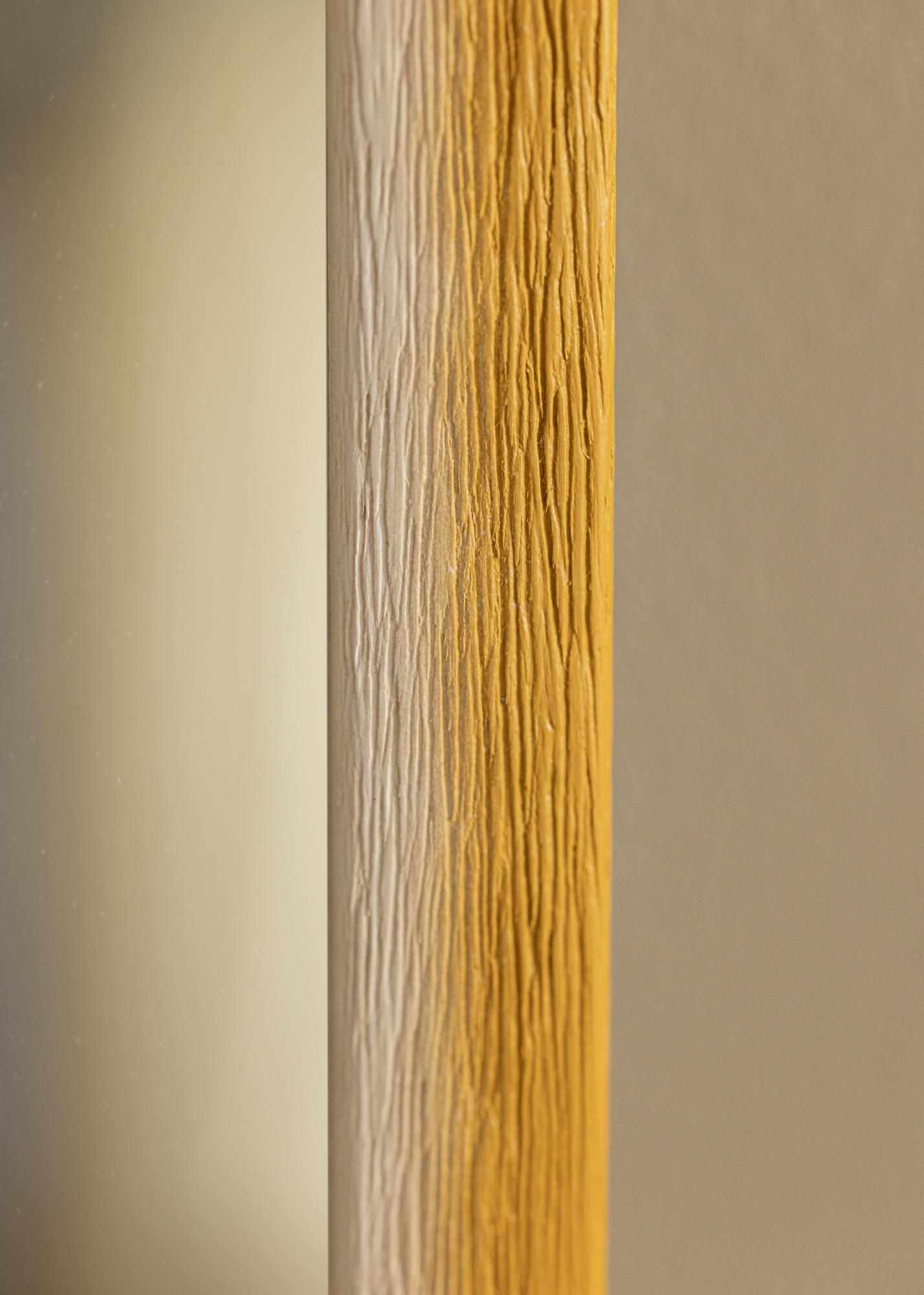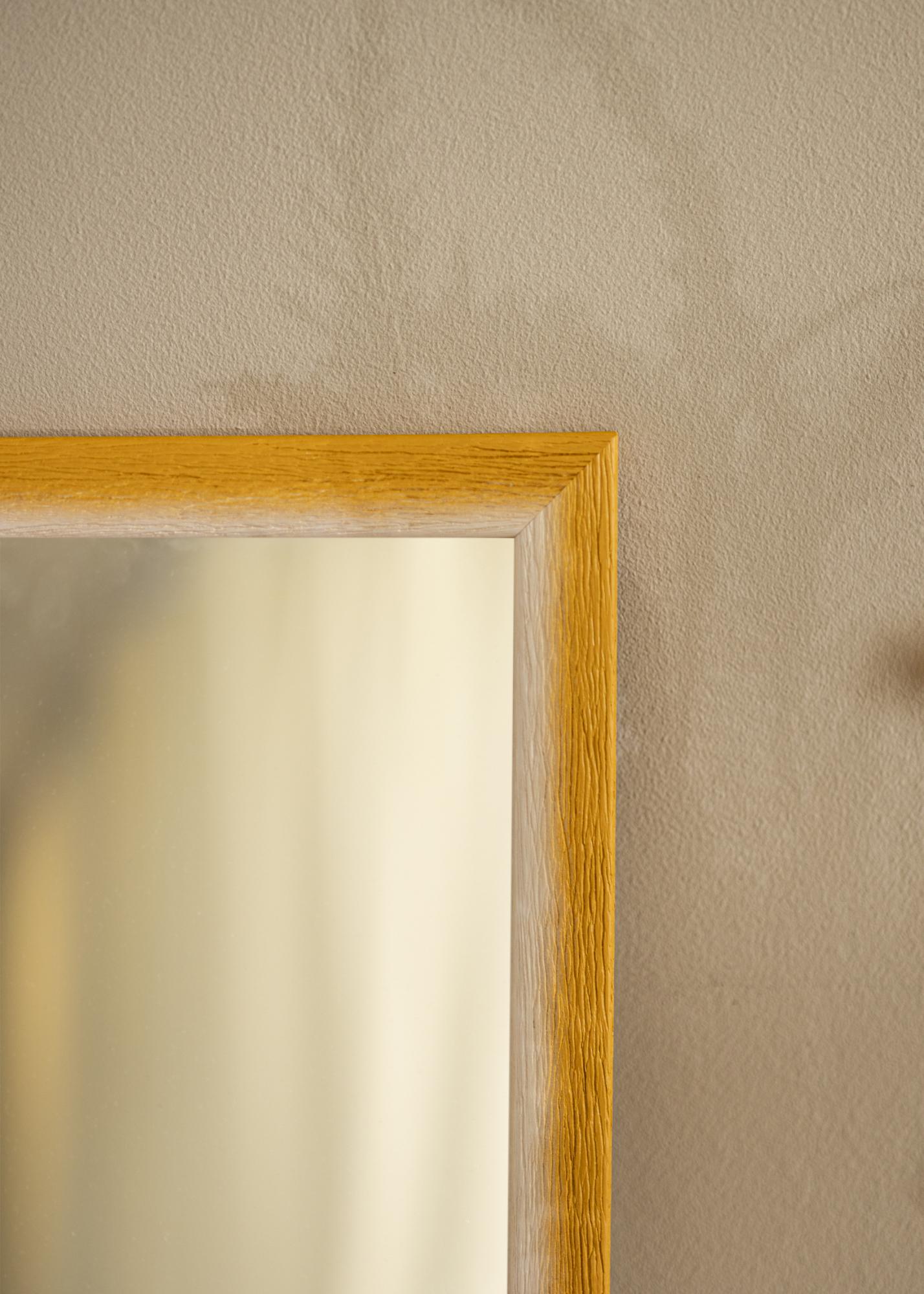 Toto zrcadlo vyniká harmonickým přechodem barev od světlého přírodního bílého odstínu až po teplý okrový žlutý tón. Tento jemný přechod vytváří měkký malovaný vzhled, který dodává prostoru živou hloubku. Povrch rámu je charakterizován výraznou dřevní strukturou s hlubokými žílami, což poskytuje hmatový a přirozený pocit. Díky tomu není zrcadlo jen funkční, ale také dekorativním prvkem ve vašem domově.