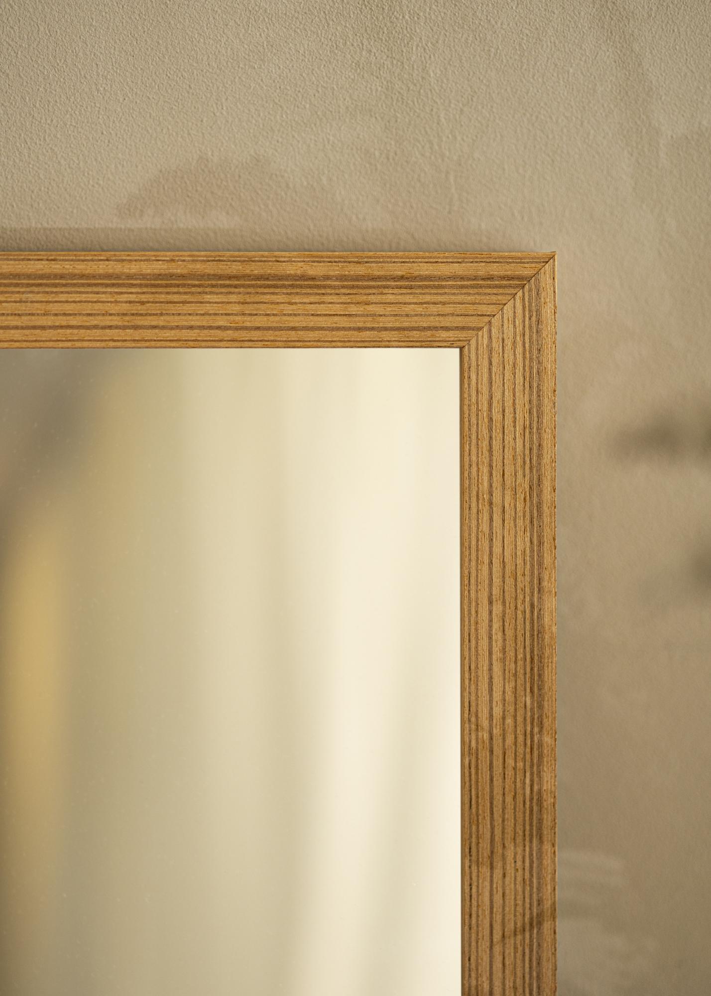Rám zrcadla je široký 28 mm a má hloubku 33 mm, což vytváří stabilní a robustní dojem. Vyrobeno z borovice, toto zrcadlo nabízí trvanlivost, která přetrvá v průběhu času. Výrazná struktura v rámu vytváří živoucí hloubku a dodává hmatový rozměr, díky čemuž zrcadlo působí živě a dynamicky.