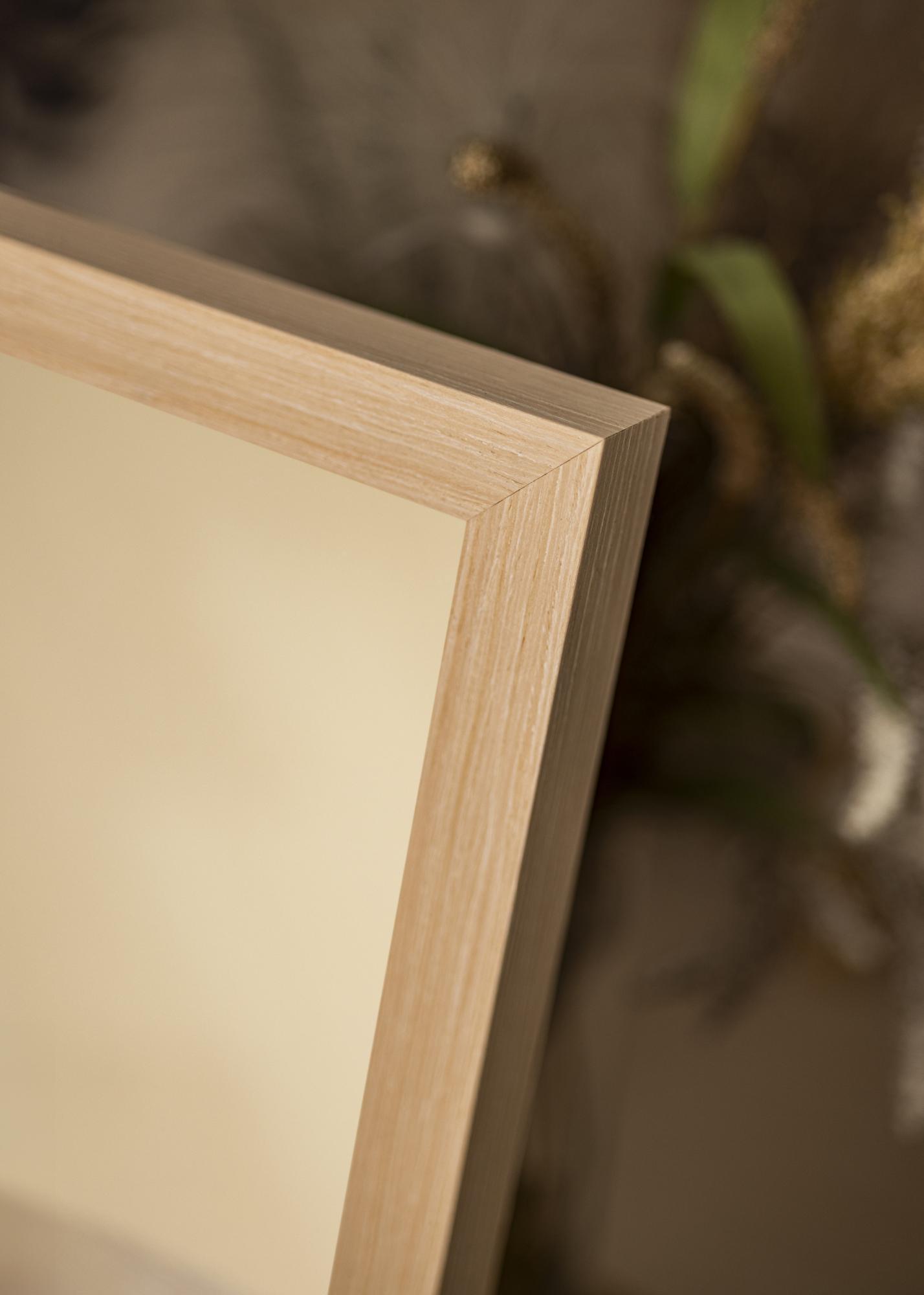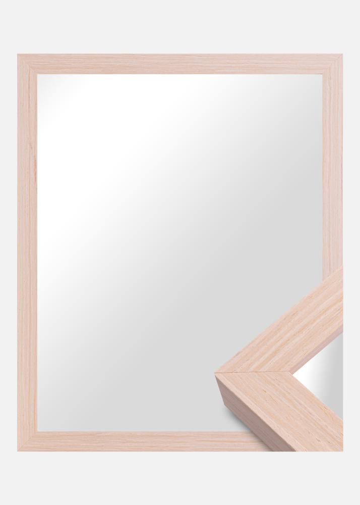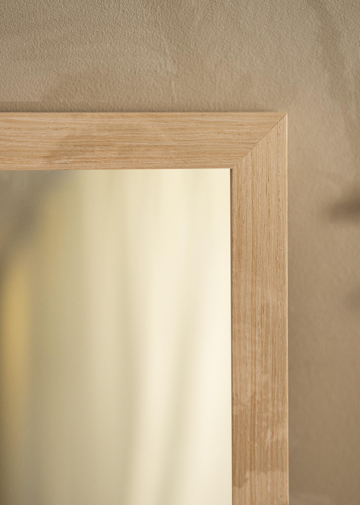 Rám zrcadla je 28 mm široký a má hloubku 33 mm, což mu dodává stabilní a robustní pocit, aniž by přebíralo prostor místnosti. Vyrobený z borovice, kombinuje odolnost s lehkostí, která usnadňuje manipulaci a montáž. Hedvábně matný povrch zvýrazňuje přirozenou strukturu dřeva, aniž by odrážel světlo, což vytváří příjemnou atmosféru v místnosti.
