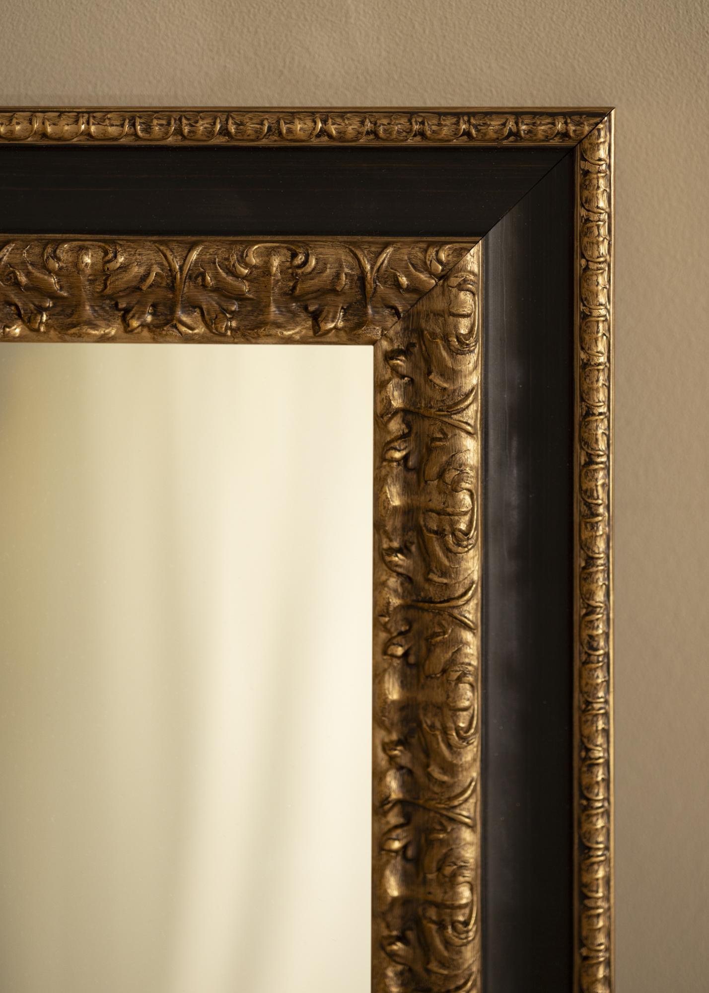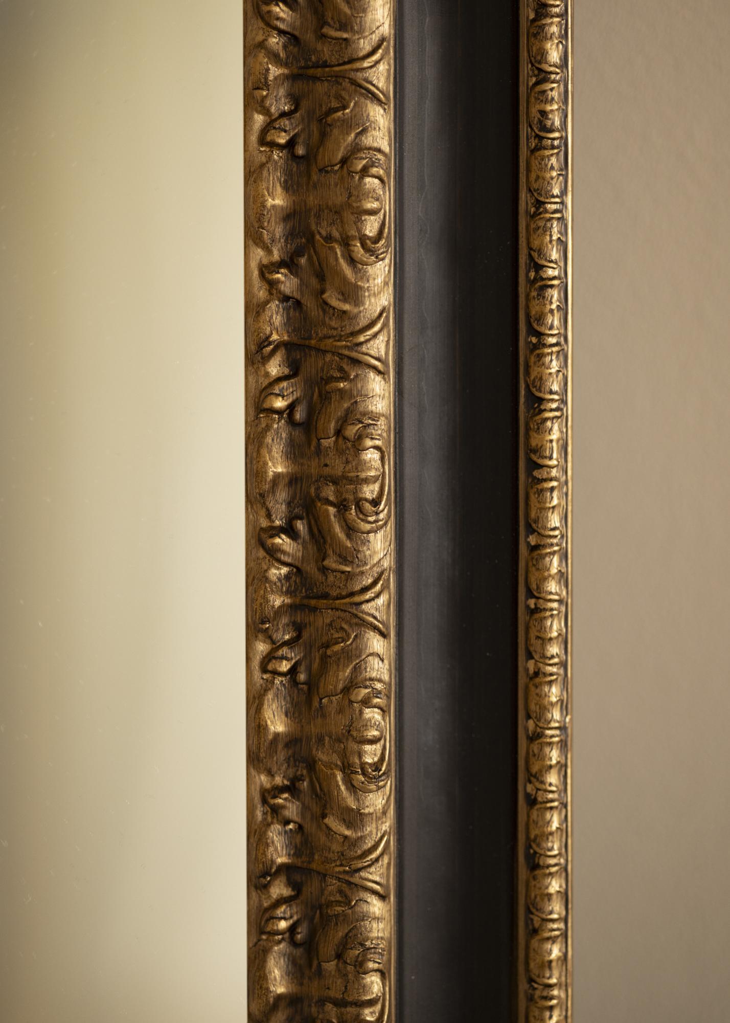 "Drottningholm Guld" je krásné zrcadlo v retro stylu z Itálie z prstencově spojeného dřeva borovice, které je ručně malované. Zrcadlo má bohatě zdobený zlatý profil s širokým černým okrajem, který dává rámu jeho elegantní nádech.