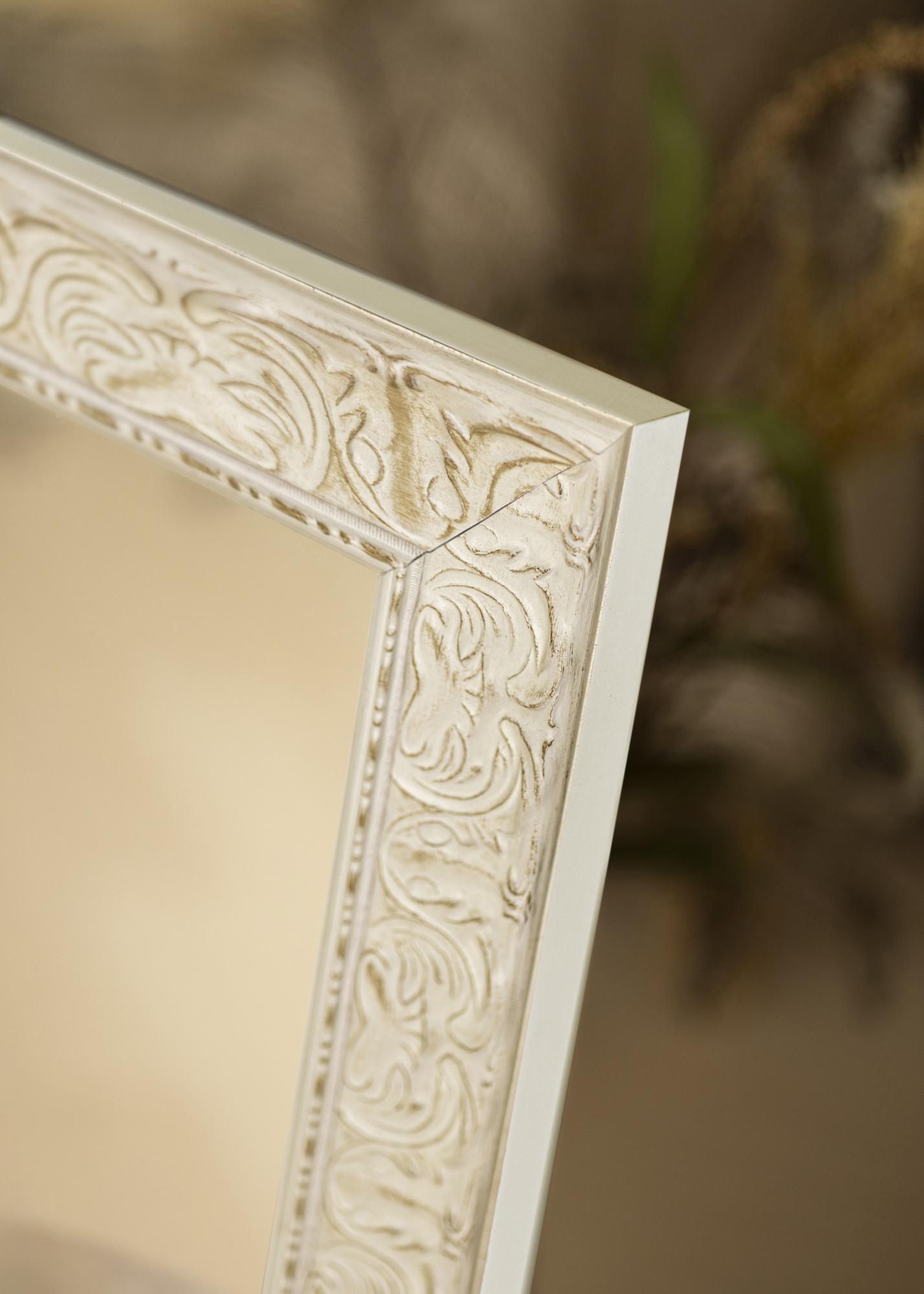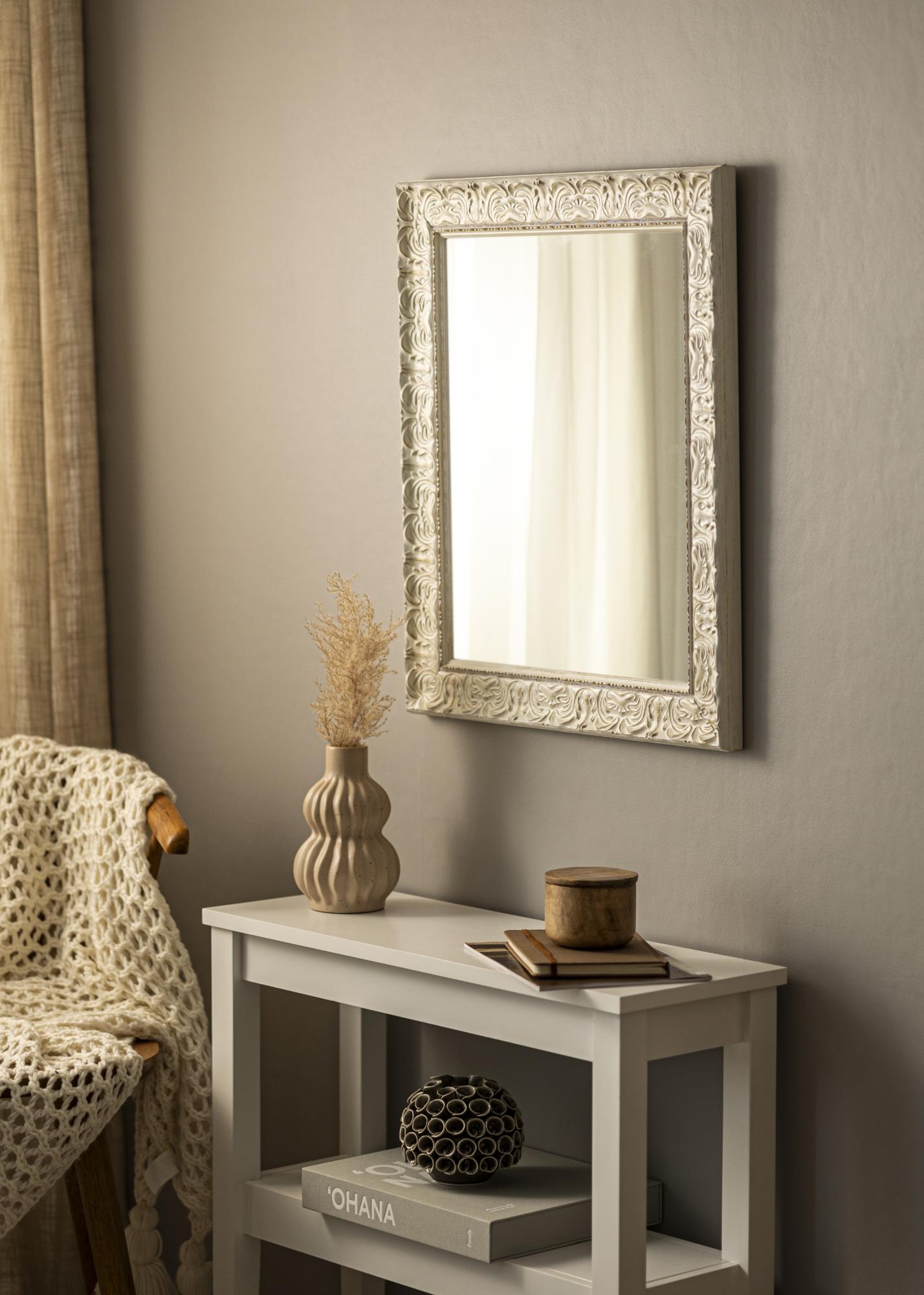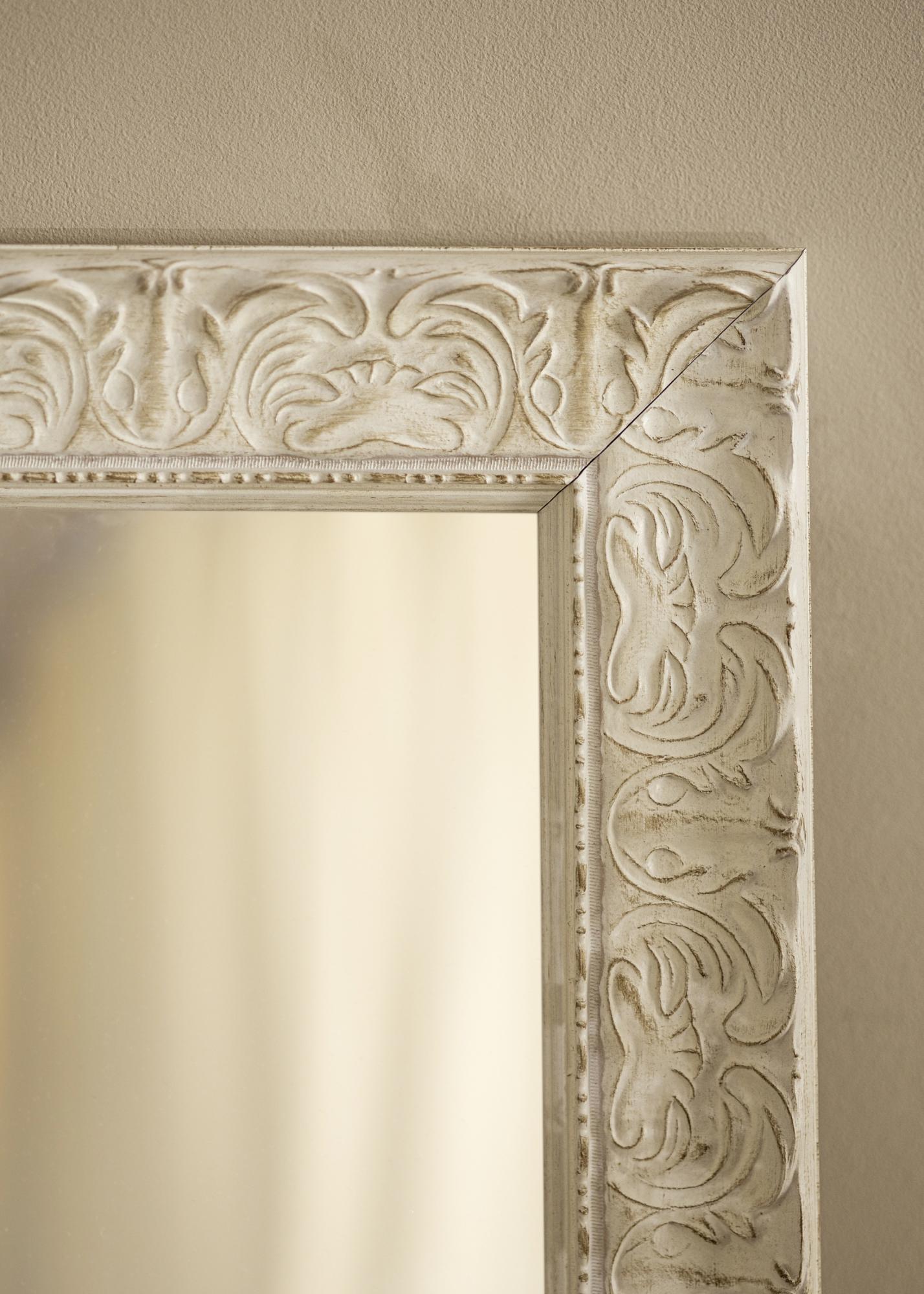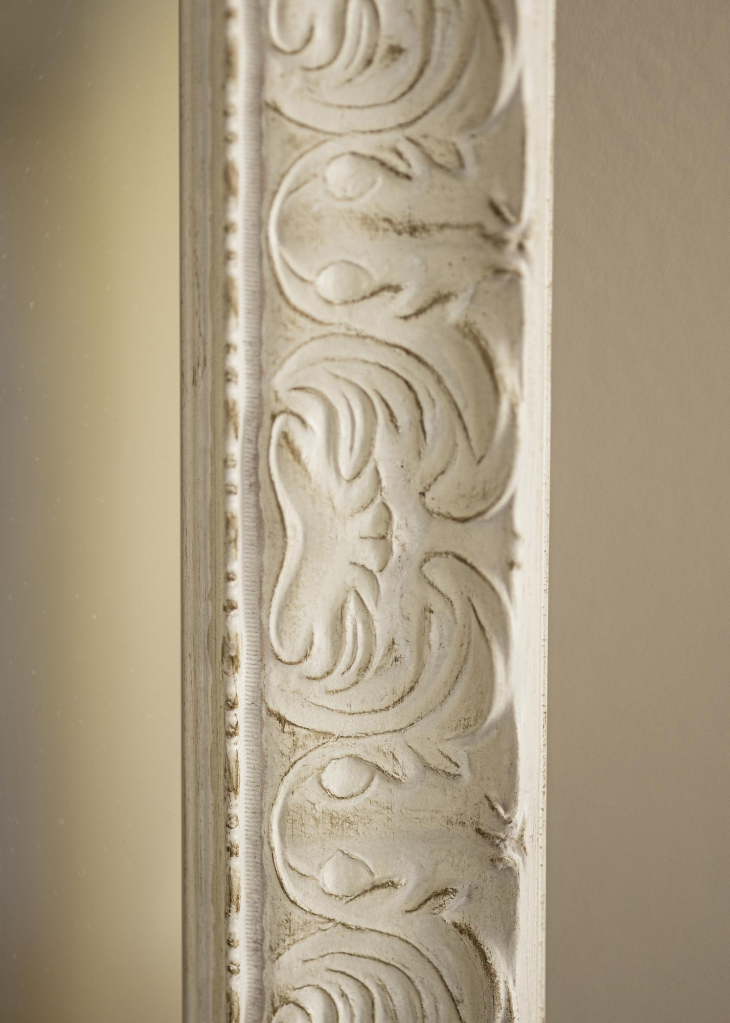 Zrcadlo má antik bílý povrch s dekorativním reliéfem a jemně opotřebovaným povrchem, což mu dodává jedinečný charakter. Ozdobné detaily posilují jeho klasický výraz a činí z něj středobod pozornosti v místnosti. Ať už máte moderní nebo tradiční interiér, toto zrcadlo se přizpůsobí a zároveň dodá něco navíc.