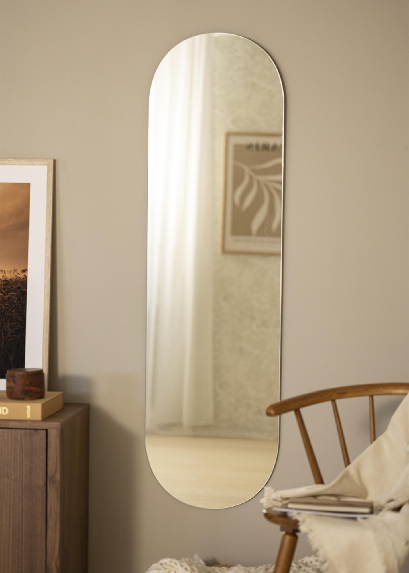 Objevte elegantní a všestranné nástěnné zrcadlo navržené tak, aby doplnilo každý pokoj ve vašem domově. Se svými velkorysými rozměry 40x140 cm nabízí toto zrcadlo praktickou a dekorativní funkci ve vašem prostoru. Jeho organický a podlouhlý tvar s zaoblenými hranami a měkkým ohybem nahoře poskytuje moderní a jemný vzhled, který se hodí do různých interiérových stylů.