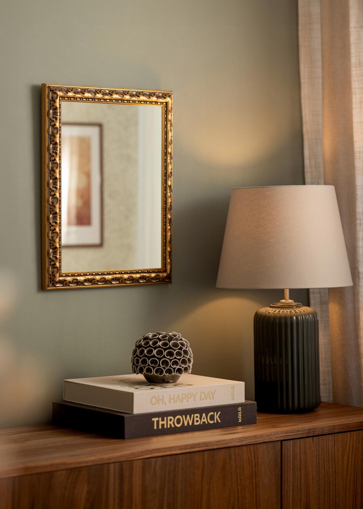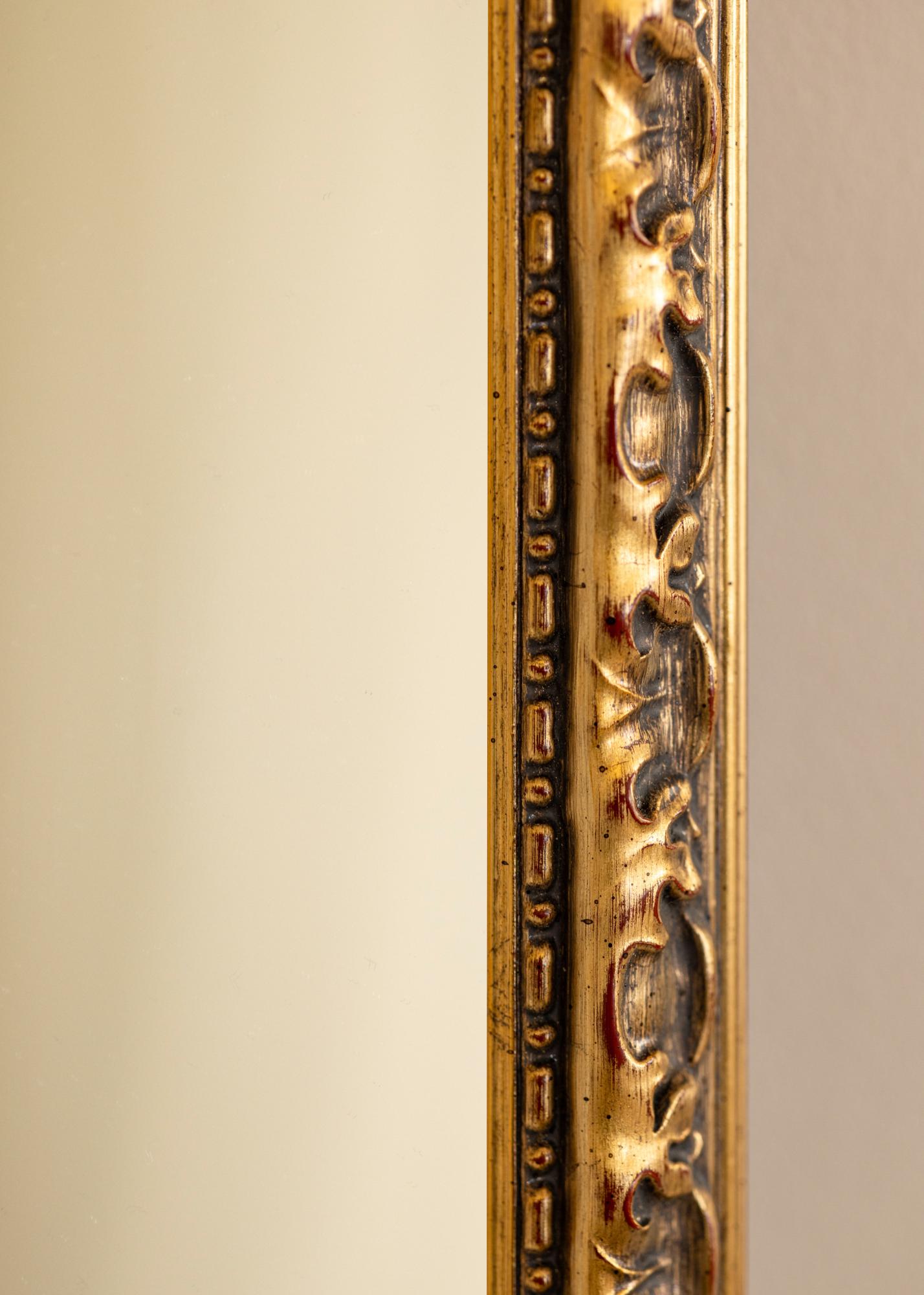 Rám zrcadla Freyja Gold je 38 mm široký a má hloubku 34 mm, což dodává zrcadlu robustní a solidní pocit. Vyrobeno z borovice, kombinuje trvanlivost s klasickou estetikou. Antická povrchová úprava s tmavými patinovanými detaily a jemnými červenými prvky posiluje rustikální charakter zrcadla a dodává mu nadčasový šarm.
