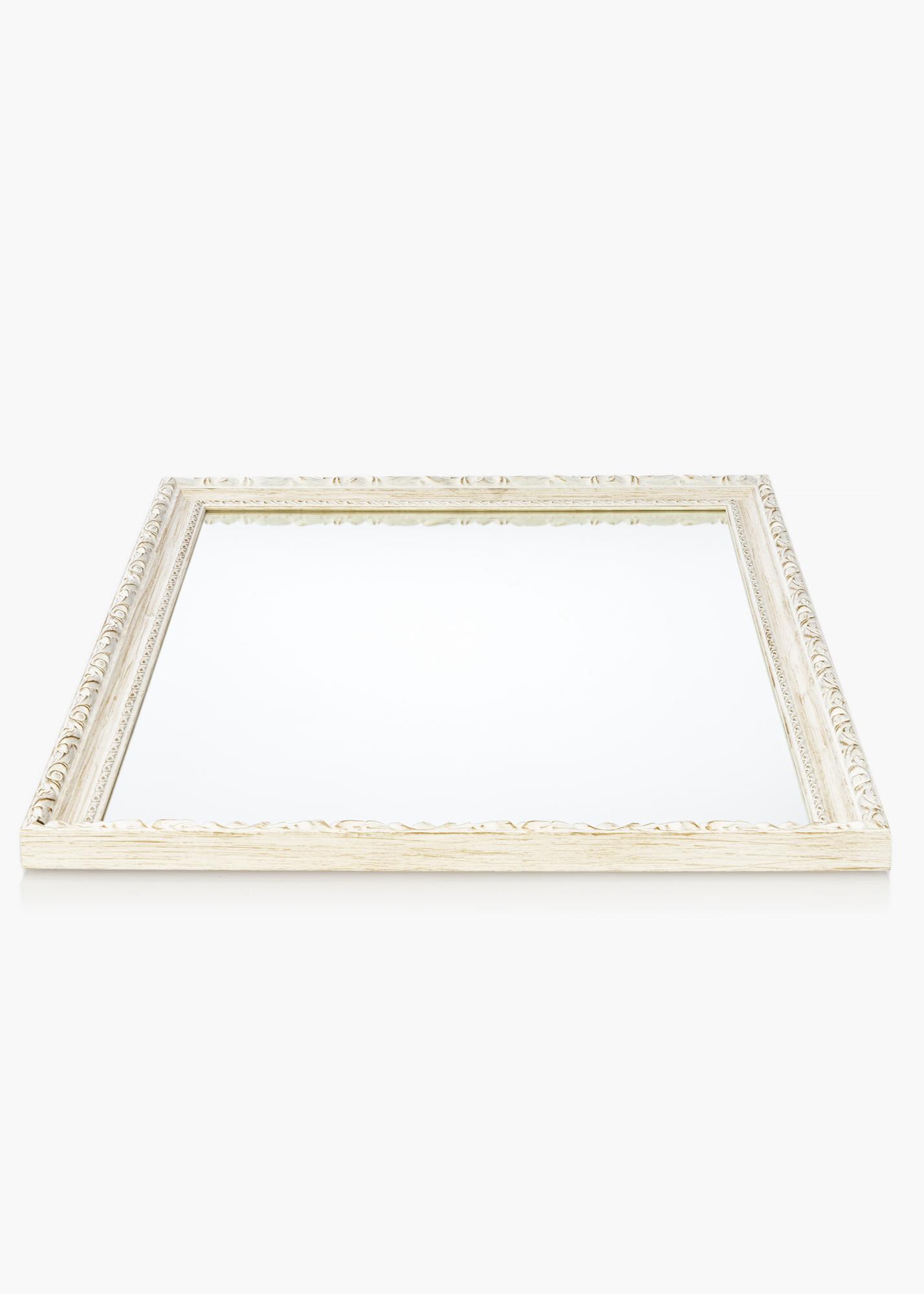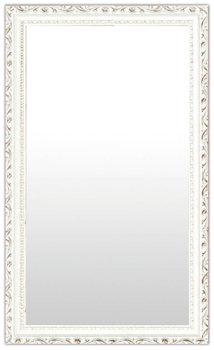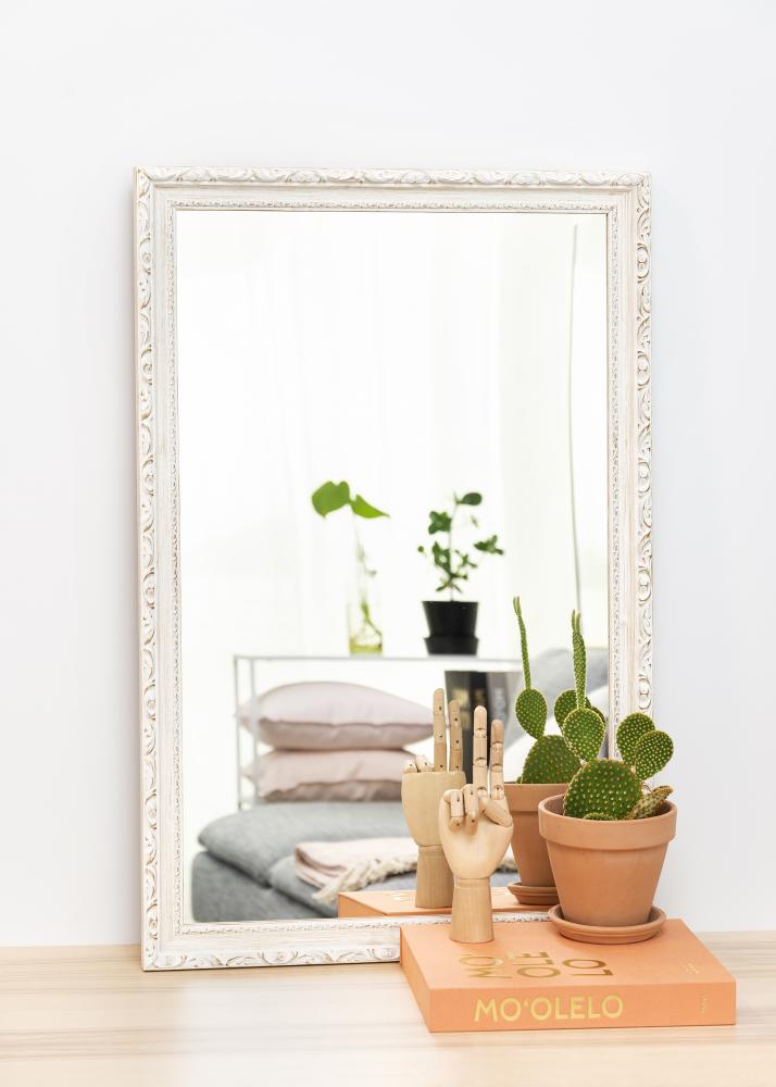 Bílé zrcadlo v antickém stylu s viditelnými dřevěnými žilkami a šířkou 40 mm. Vynikající volba, když hledáte zrcadlo, které vyniká a zaujme.