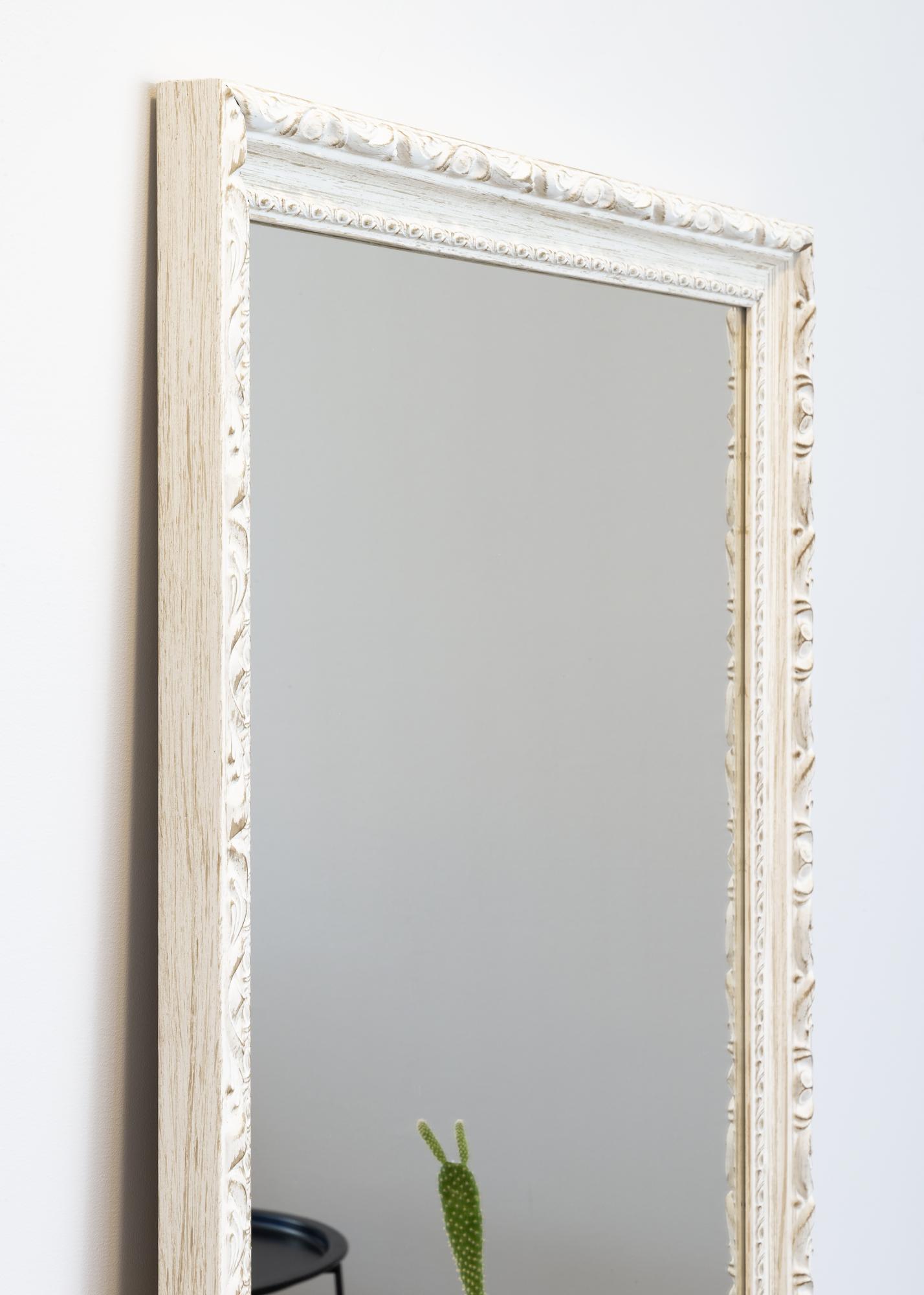 Spusťte výběr rámu »Bílé zrcadlo v antickém stylu s viditelnými dřevěnými žilkami a šířkou 40 mm. Vynikající volba, když hledáte zrcadlo, které vyniká a zaujme.