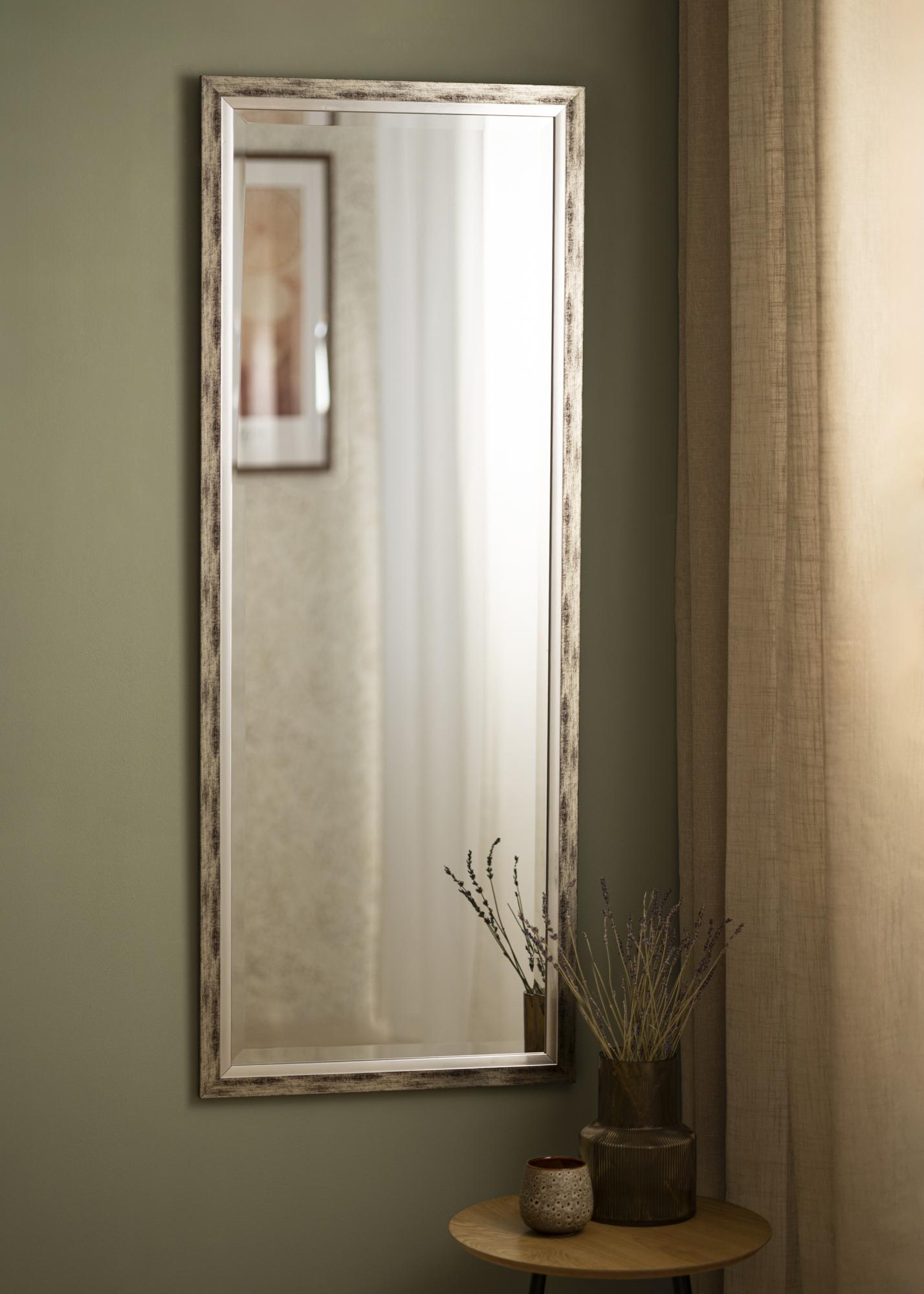 Udělejte stěnu zajímavou s tímto krásným zrcadlem! Zrcadlo má stříbrný rám s širokou "opotřebovanou" částí na okraji a stříbrnou částí blízko skla. Sklo je elegantně nakloněné a celek vytváří hloubku na vaší stěně. Design se hodí jak do venkovského, moderního domova, tak i do více městského prostředí. Vyberte si z velikostí 40x80 cm, 60x80 cm a 50x130 cm.