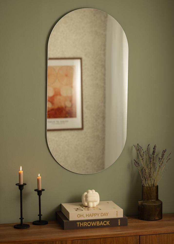 Podlouhlý, oválný tvar s hladkým a zaobleným obrysem dodává místnosti harmonický pocit. Design zrcadla není jen esteticky přitažlivý, ale také funkční, s možností zvolit si, která strana bude nahoře nebo dole, aby odpovídala vašemu interiéru. Ať už ho umístíte kamkoli, toto zrcadlo se stane ceněným detailem ve vašem domově.