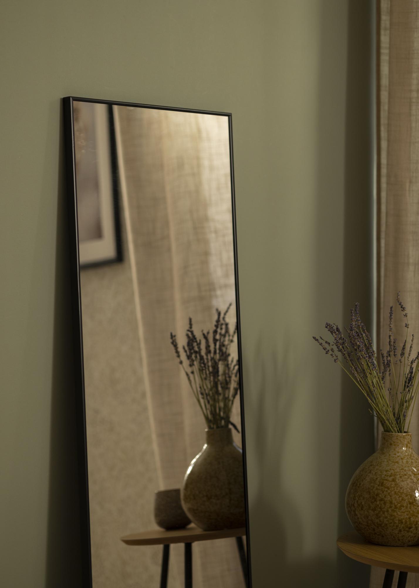 Díky své stojící orientaci se zrcadlo skvěle hodí do úzkých prostor nebo jako celoplošné zrcadlo v ložnici či chodbě. Černý rám doplňuje různé styly interiéru a barevná schémata, čímž se stává všestranným dekoračním prvkem. Zrcadlo není jen krásným detailem, ale také praktickým nástrojem pro vytvoření světla a prostoru ve vašem domově.