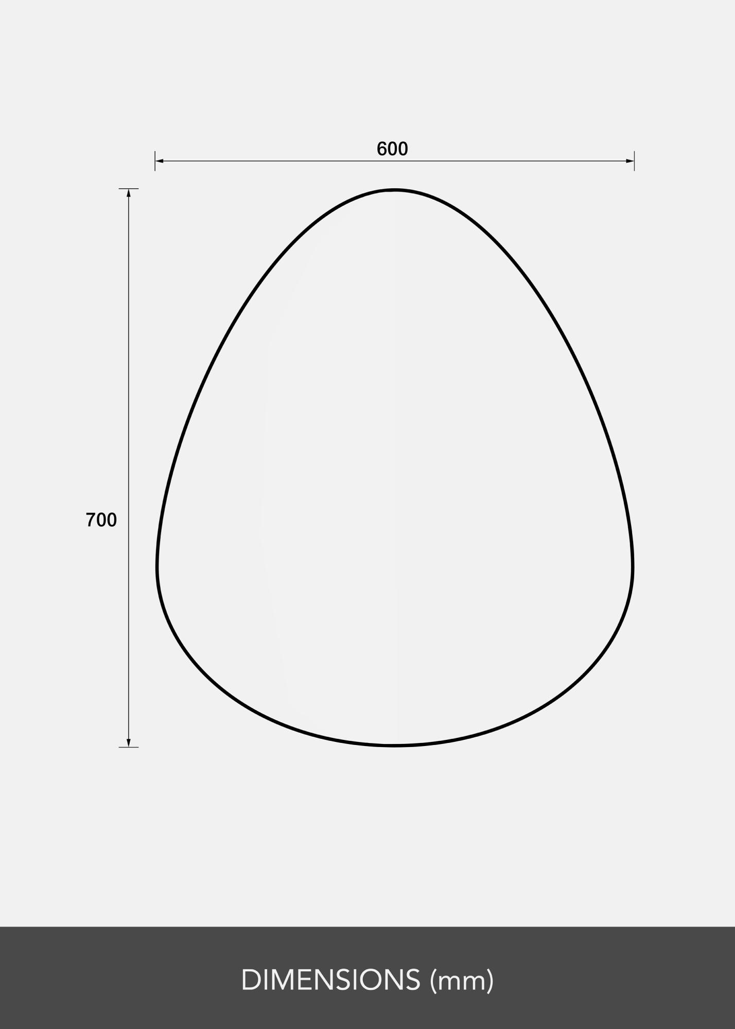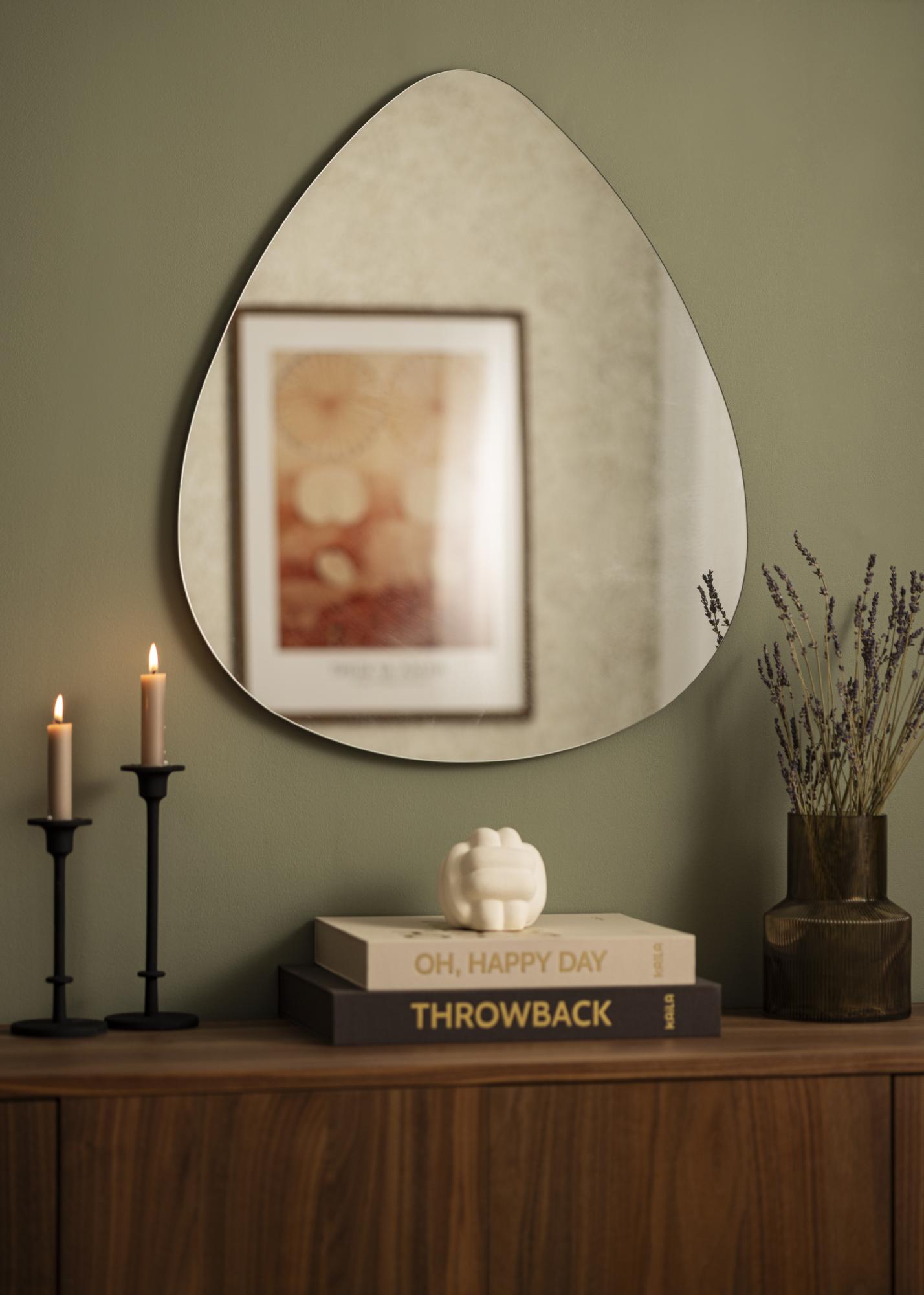 Design zrcadla je moderní i nadčasový, se širokým, zužujícím se a zaobleným vrcholem, který vytváří výraznou kapkovitou siluetu. Tento tvar dodává místnosti měkkost a organický pocit, díky čemuž se zrcadlo hodí do různých stylů interiéru.