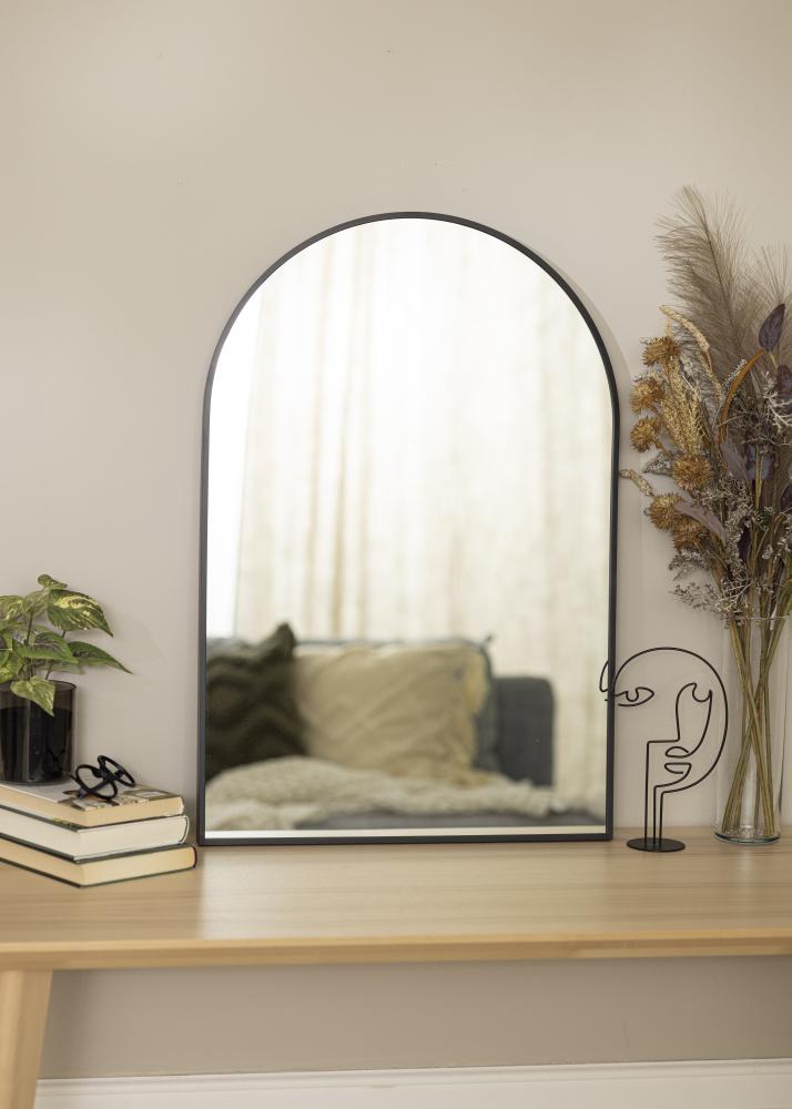 Toto je vynikající volba pro ty, kteří hledají zrcadlo v moderním designu s trendy obloukovým provedením a stylovým černým rámem. Rám zrcadla má hloubku 28 mm a je vyroben z kovu. Toto zrcadlo se stane úžasným dekoračním prvkem v předsíni nebo obývacím pokoji, kde krásně odráží světlo ze všech světelných zdrojů v místnosti. Robustní materiál znamená, že ho lze také použít v koupelně.