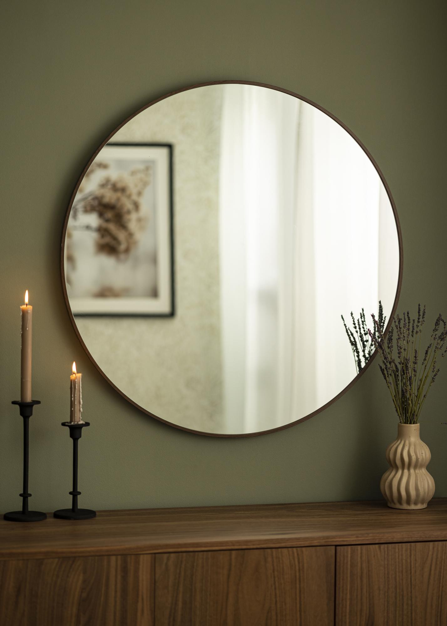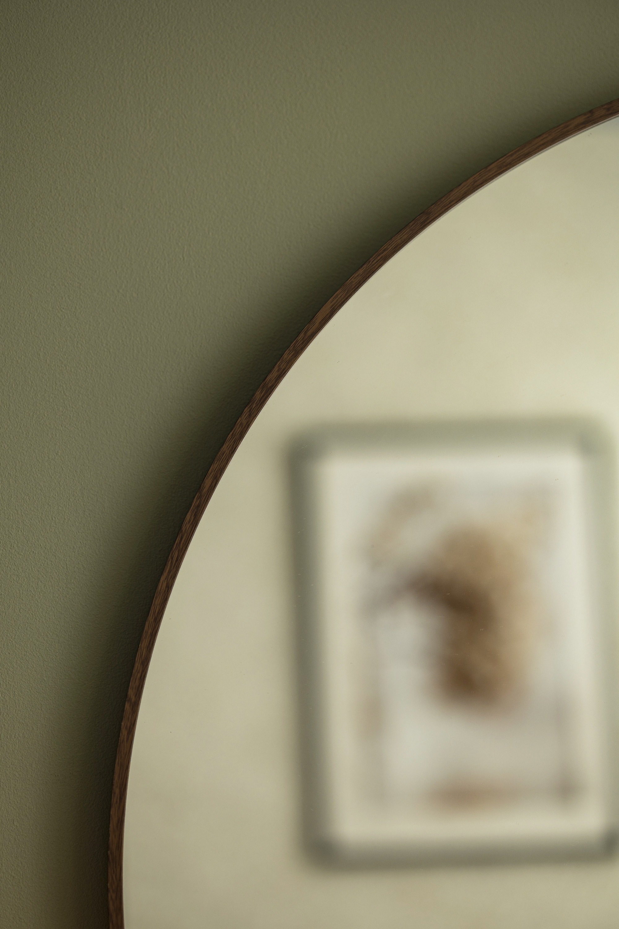 Objevte stylovou eleganci s naším nástěnným zrcadlem, ideálním pro přidání pocitu prostoru a světla do vašeho domova. S impozantním průměrem 80 cm se toto zrcadlo stává okamžitým středem pozornosti v jakékoliv místnosti. Jeho kulatý tvar poskytuje jemný a přívětivý pocit, zatímco rámeček z ořechově zbarveného hliníku dodává nádech sofistikovanosti.