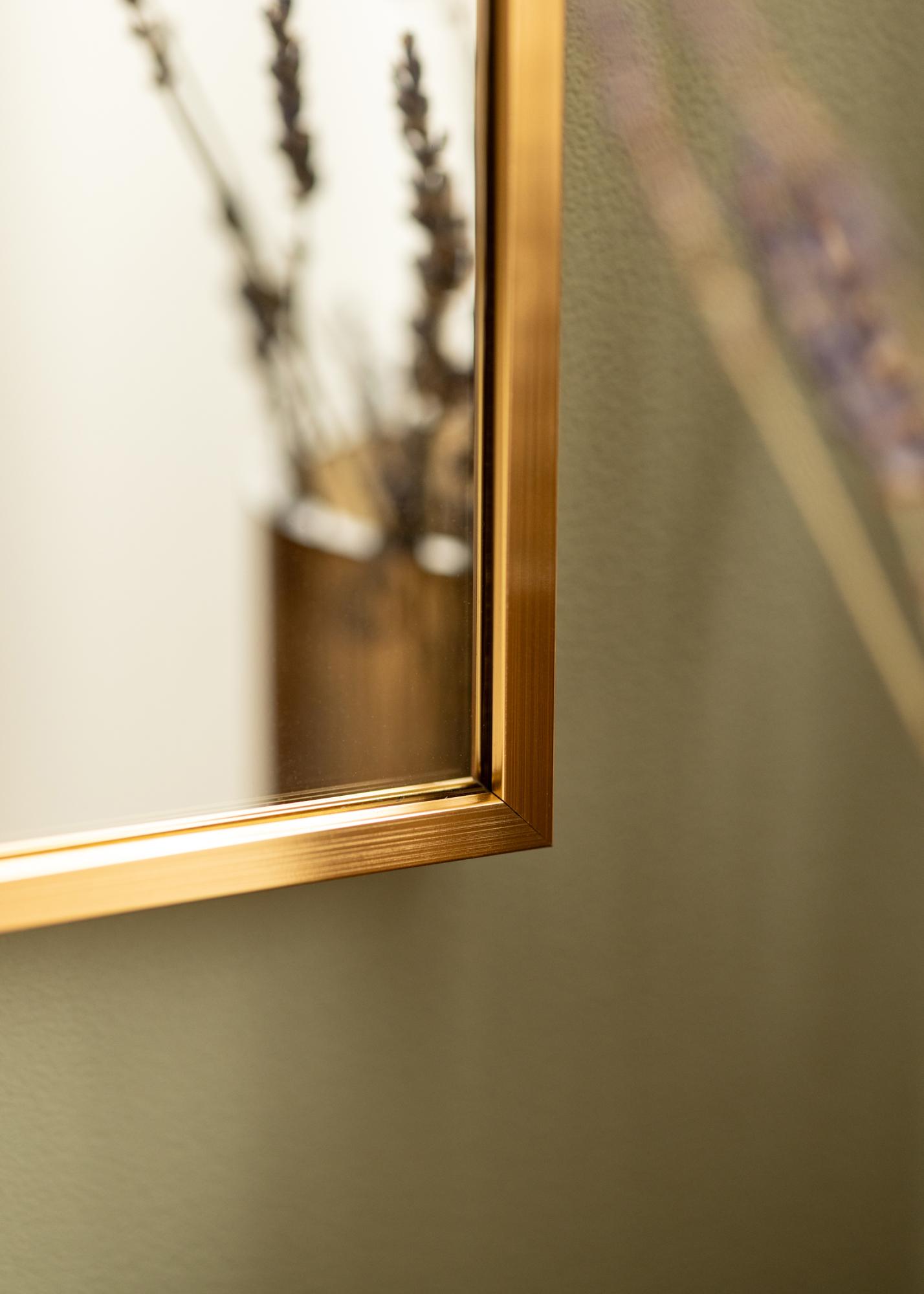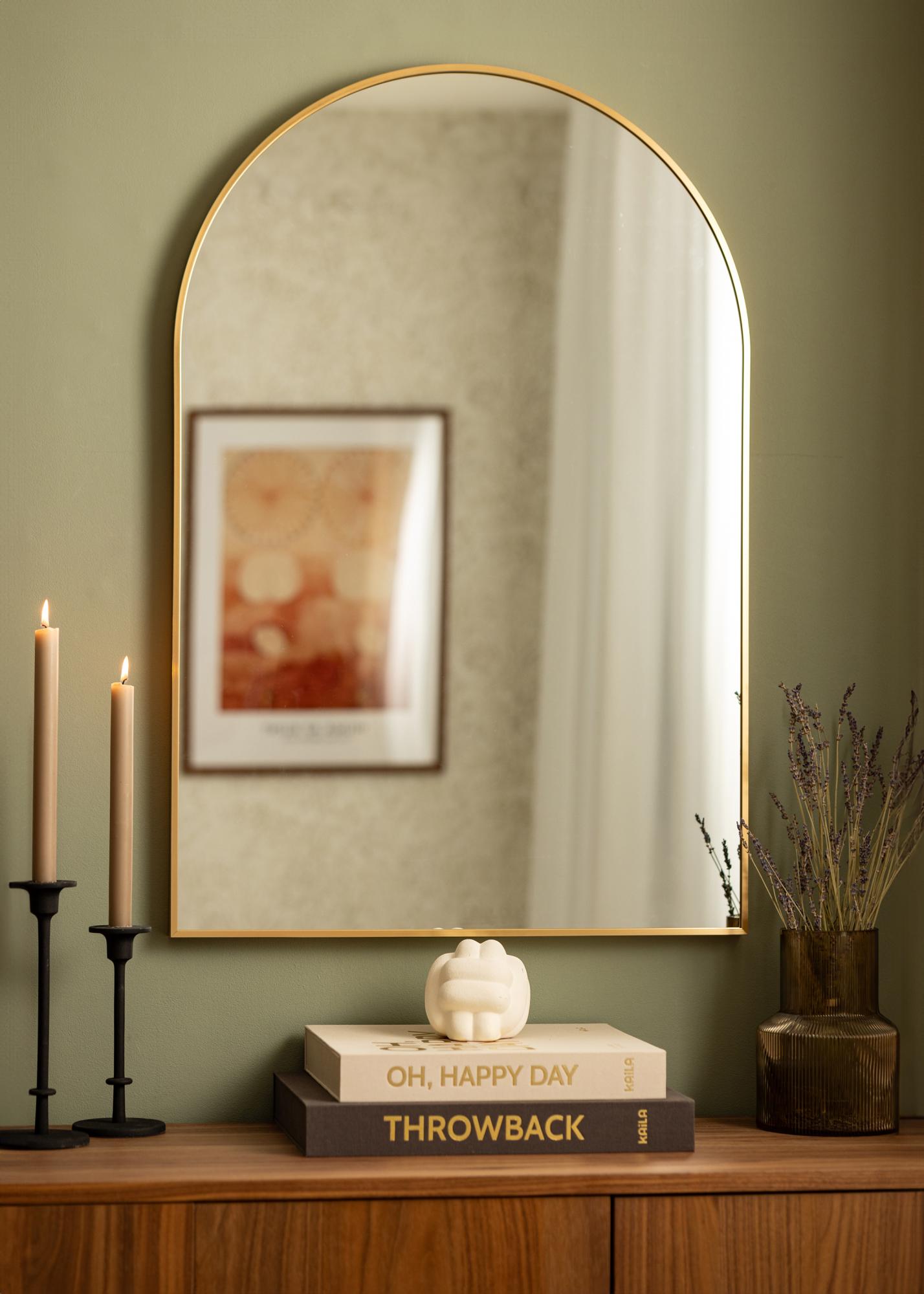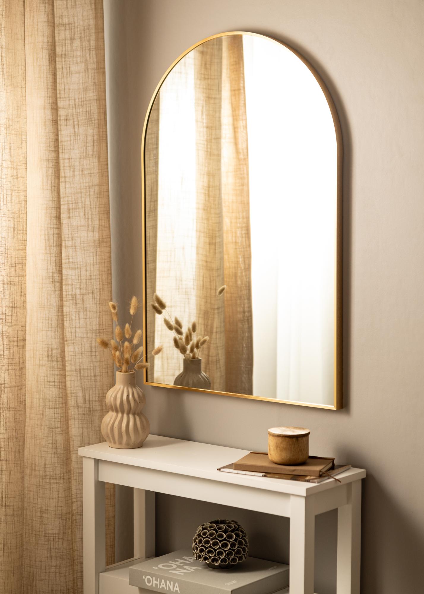 Toto je moderní nástěnné zrcadlo, které lze použít v každé místnosti. Může se stát trendy prvkem v ložnici nebo obývacím pokoji, nebo ho použít jako koupelnové zrcadlo či zrcadlo na chodbě, abyste se mohli pořádně prohlédnout, když se připravujete na den. Zrcadlo má 28 mm hluboký rám z kovu, s exkluzivním zlatým odstínem, který mu dodává vynikající eleganci. Stylový obloukový tvar inspirovaný velrybou dále posiluje luxusní vyjádření.