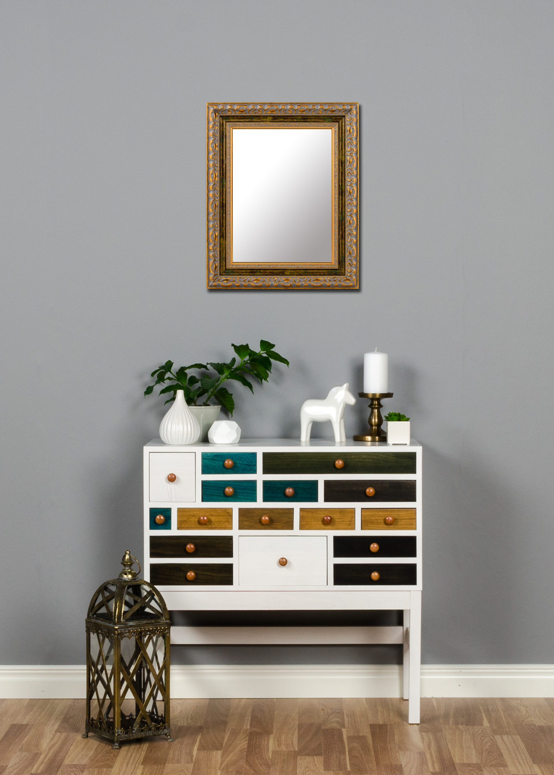 Pomocí správného zrcadla můžete oživit celou stěnu! Toto luxusní zlaté zrcadlo má vzrušující design, který přitahuje pozornost. Zepředu má dřevěný rám jak široký, tak i úzký pás se vzorovanými kudrlinkami, které jsou přerušeny opotřebovanou částí. Povrch je ošetřen, aby vypadal charakteristicky zestárle. Protože je vyrobeno podle vašich rozměrů, můžete si být jisti, že se dokonale hodí tam, kde ho chcete mít!