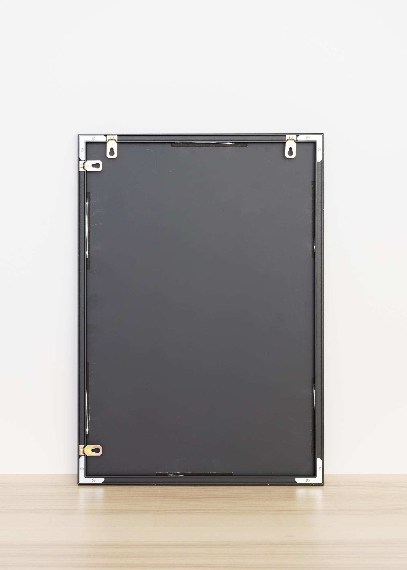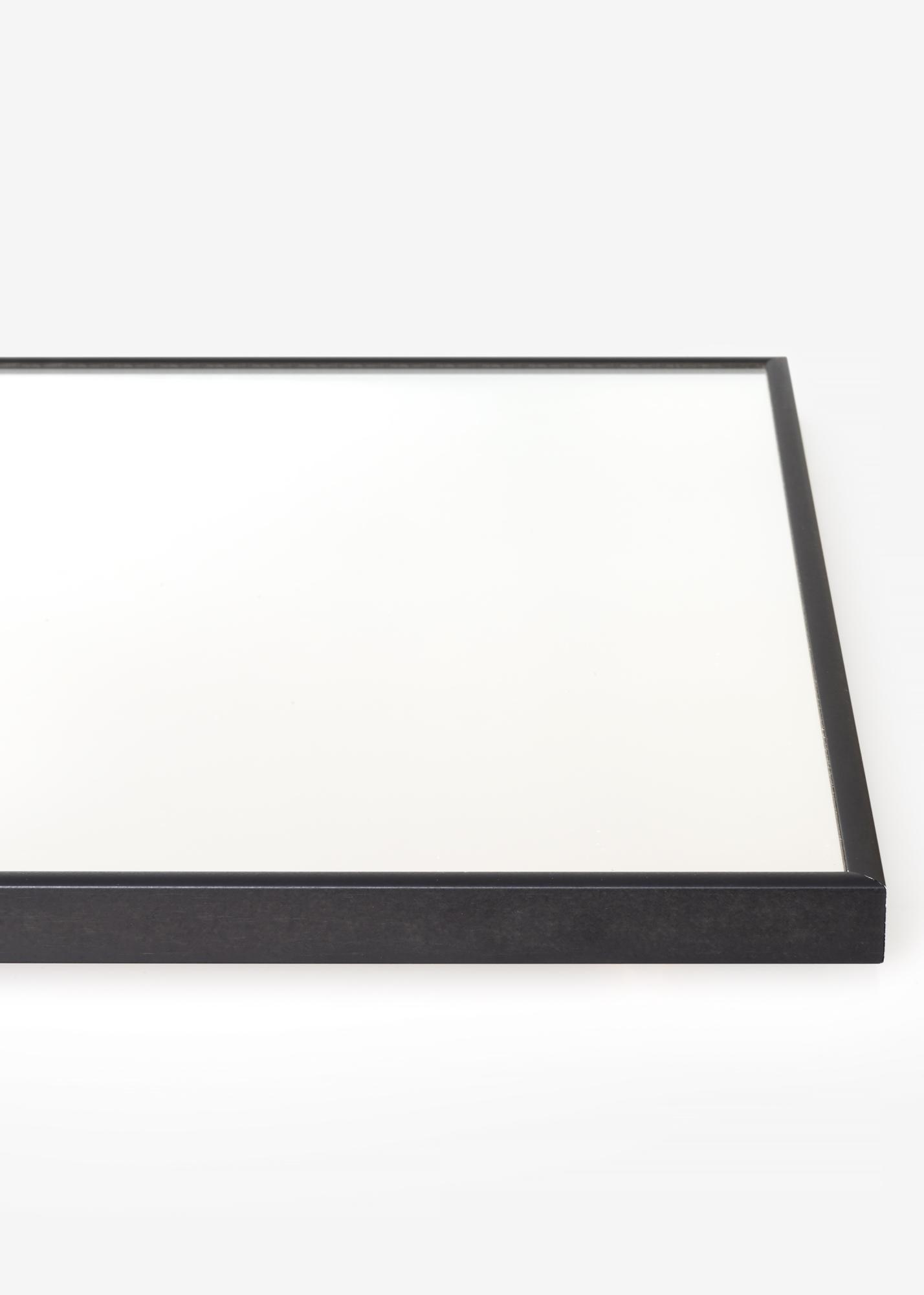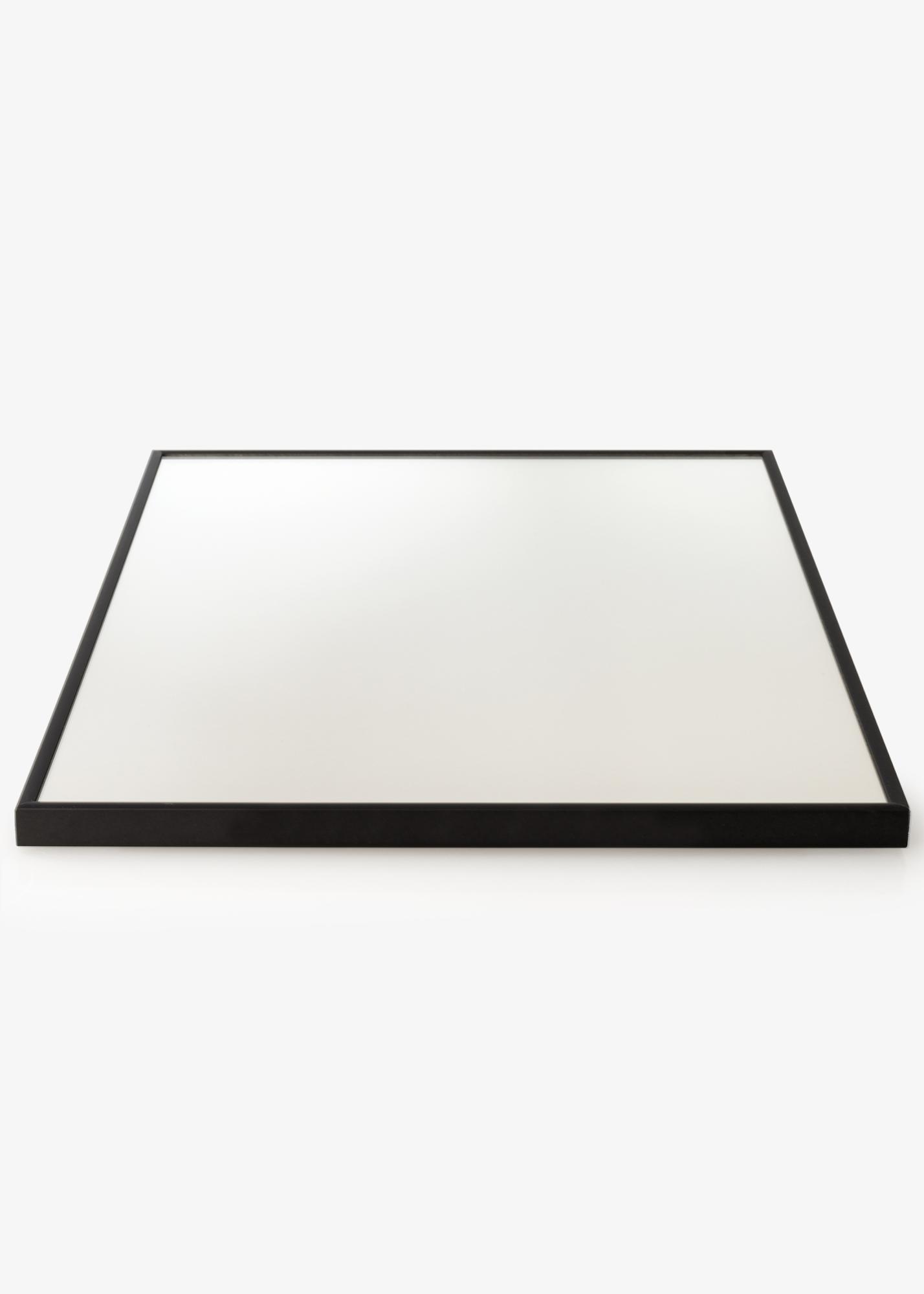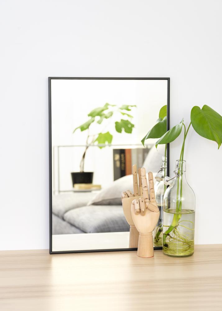 Moderní zrcadlo s černým hliníkovým rámem. Zrcadlo je vybaveno chytrými nástěnnými držáky, které umožňují snadné zavěšení.