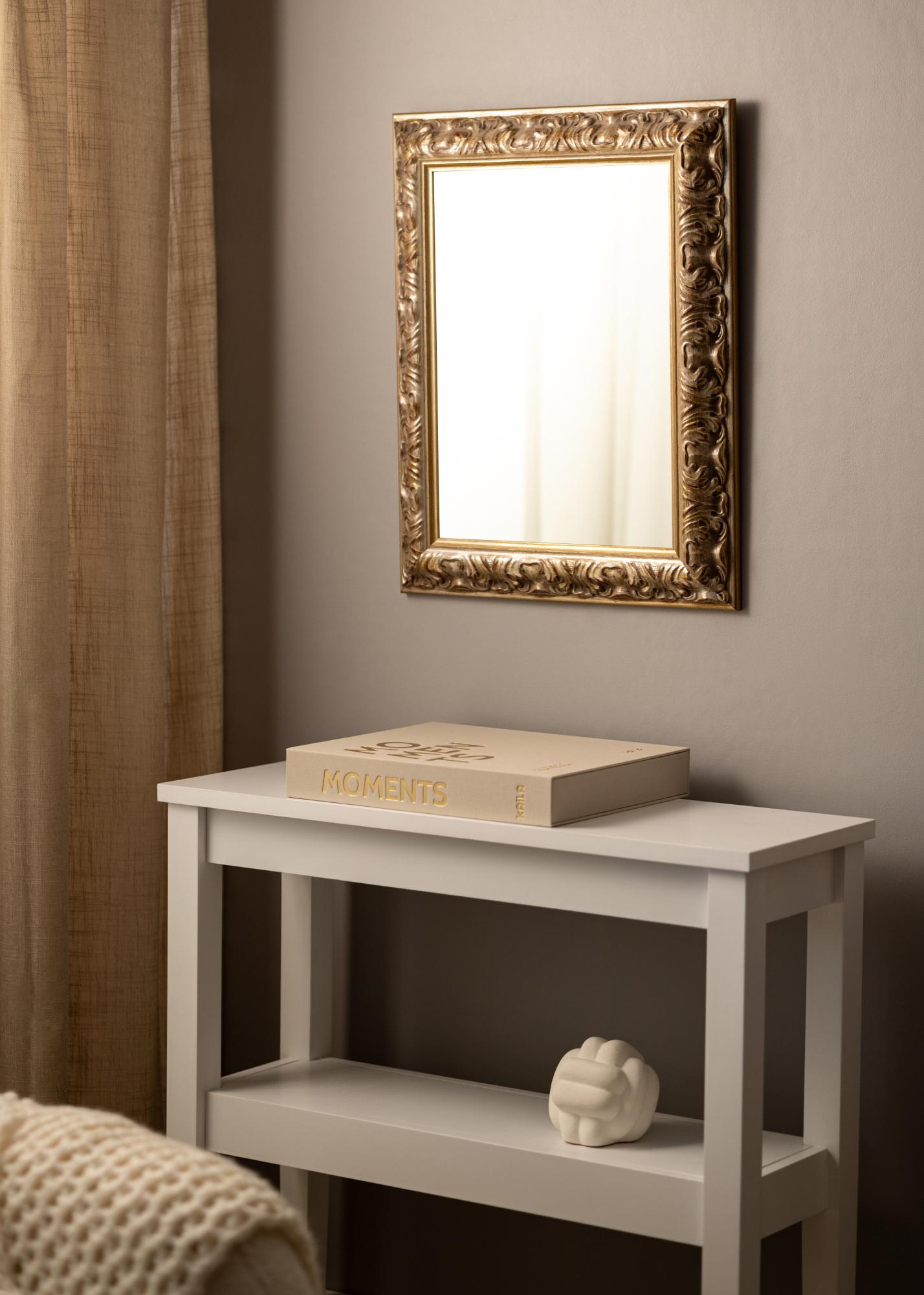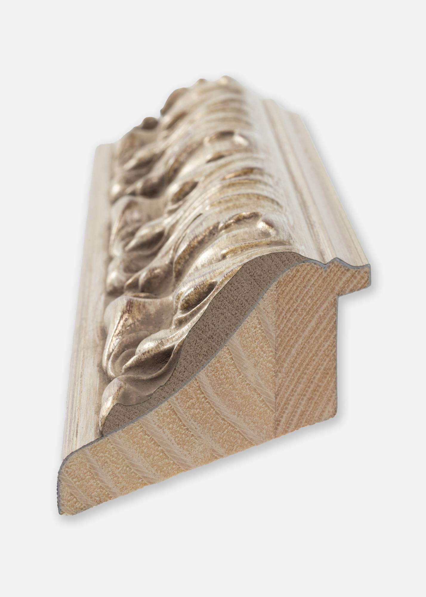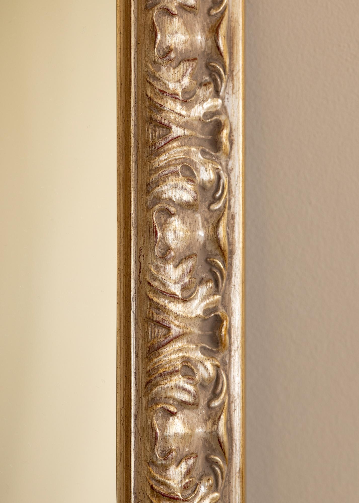 Rám je vyroben z borovice a má antický stříbrný povrch s jemnými zlatými detaily a červenými prvky. Tato barevná kombinace vytváří krásný kontrast a dodává zrcadlu klasický a sofistikovaný vzhled. Dekorativní vzhled zrcadlo činí perfektním pro orámování tam, kde se usiluje o elegantní dojem.